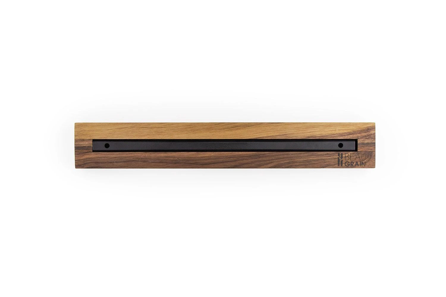 The magnetic material is encased in the wood so you don’t need to worry about scratching your knife. Screw them onto the wall and voila.