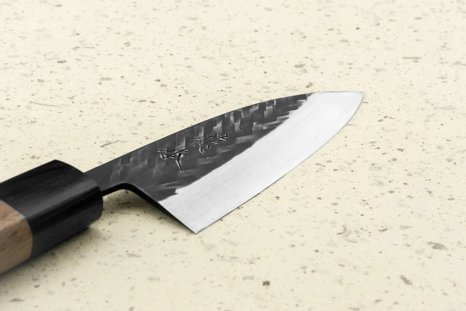 I’ve always loved blades like this with a hammered ‘tsuchime’ texture and a dark ‘kurouchi’ finish because they show the love that went into making the knife and just looks so badass. This particular blade is forged from SLD steel, which takes a crazy edge and holds it super well but isn’t high maintenance like some Japanese steels. Just wash by hand and wipe it dry to avoid rust!