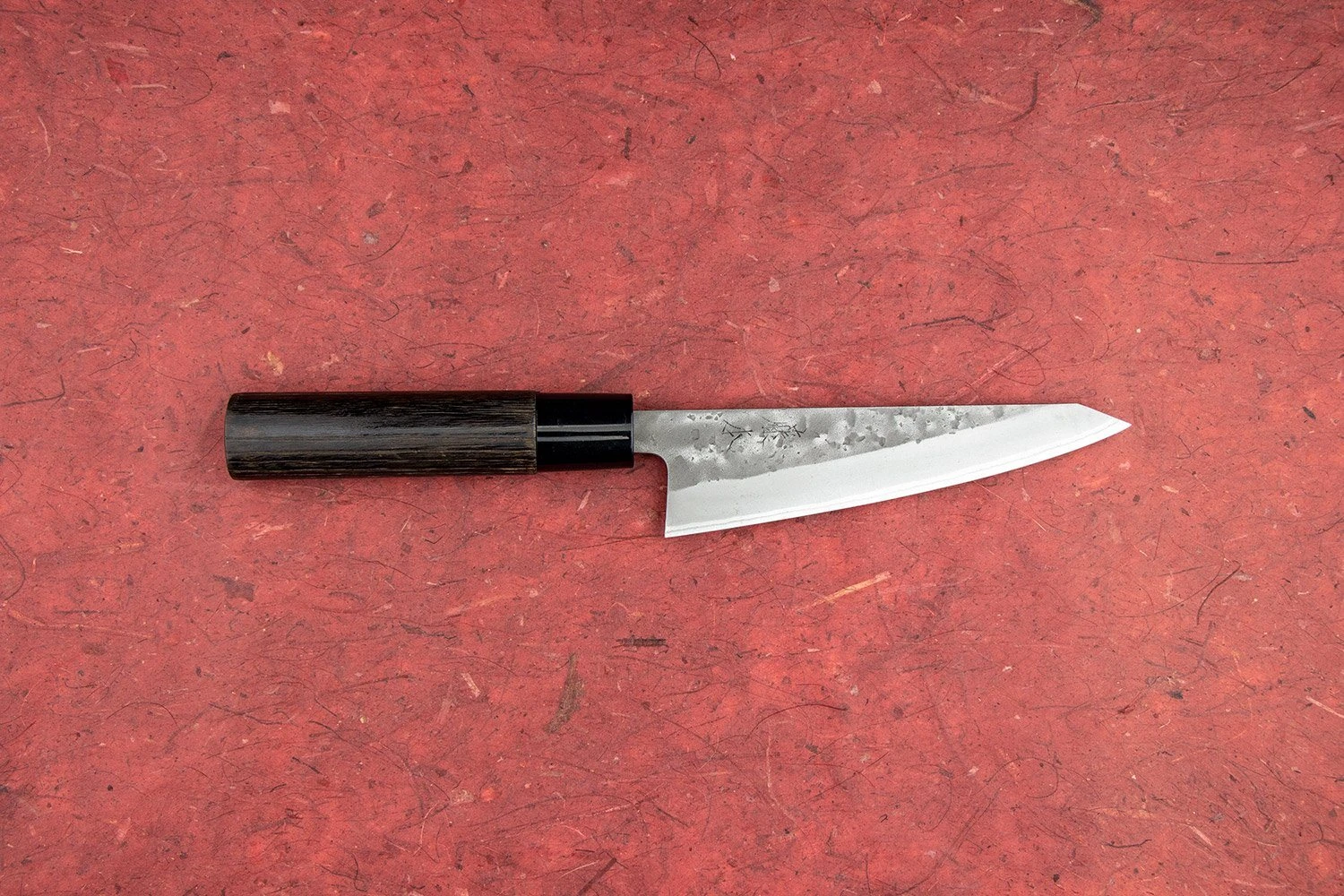 These were the first Fujimoto blades we carried; to this day, they remain a staff and customer favourite. Here’s why: some Japanese blades are made with carbon steel, which gets crazy sharp but can rust, while others are made from stainless steel, which is easy to care for but doesn’t quite have the same magic. These are the best of both worlds, made with a super hard carbon steel core, protected by an outer layer of stainless steel, so only the edge requires maintenance! It’s a genius way of making a knife, and the ‘nashiji’ finish, inspired by the look and feel of Asian pear skin, takes it over the top.