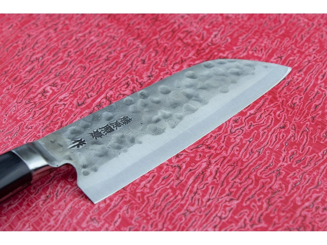 Fujiwara is one of the most revered names in the world of Japanese knives. The Fujiwara family started as blacksmiths in 1870, first forging farm tools, then swords. Many blacksmiths these days make a blade with a carbon steel core laminated with an outer layer of stainless steel for a high-performance knife with lower maintenance; this guy was one of the first to develop this technique. In addition to laminating his own steel, he pushes his steel to its absolute limit of hardness. This creates a blade that requires respect and care but stays sharp for a ridiculously long time.