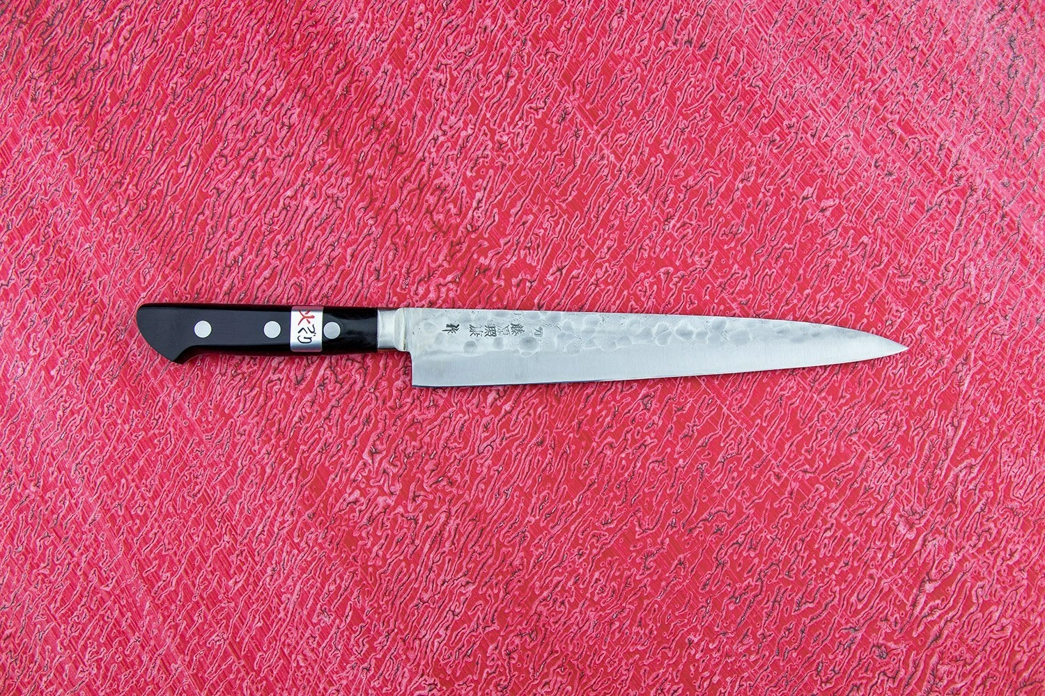 About the shape – “Sujihiki” translates to “Flesh Slicer” and it does exactly what the name suggests, perfect for carving and slicing roasts, turkey, raw meats, fish, and all other proteins and the extended blade length allows you to slice with one long stroke, instead of sliding the knife back and forth in a sawing motion. Making clean slices of brisket or ultra thin applications like Carpaccio a breeze to execute.