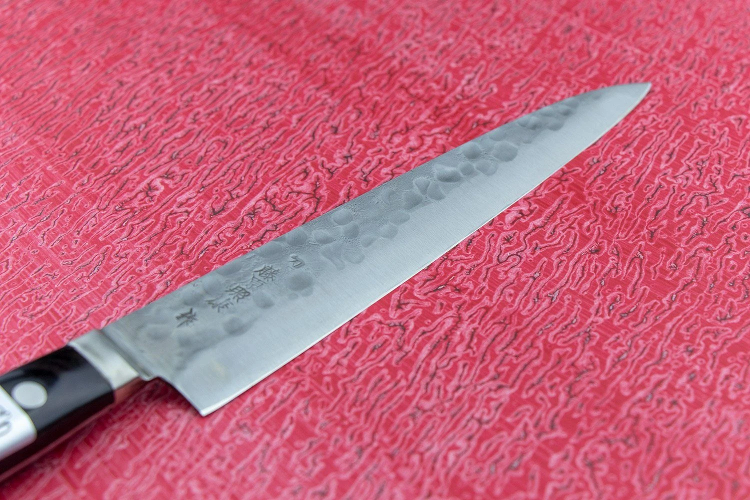 Fujiwara is one of the most revered names in the world of Japanese knives. The Fujiwara family started as blacksmiths in 1870, first forging farm tools, then swords. Many blacksmiths these days make a blade with a carbon steel core laminated with an outer layer of stainless steel for a high-performance knife with lower maintenance; this guy was one of the first to develop this technique. In addition to laminating his own steel, he pushes his steel to its absolute limit of hardness. This creates a blade that requires respect and care but stays sharp for a ridiculously long time.