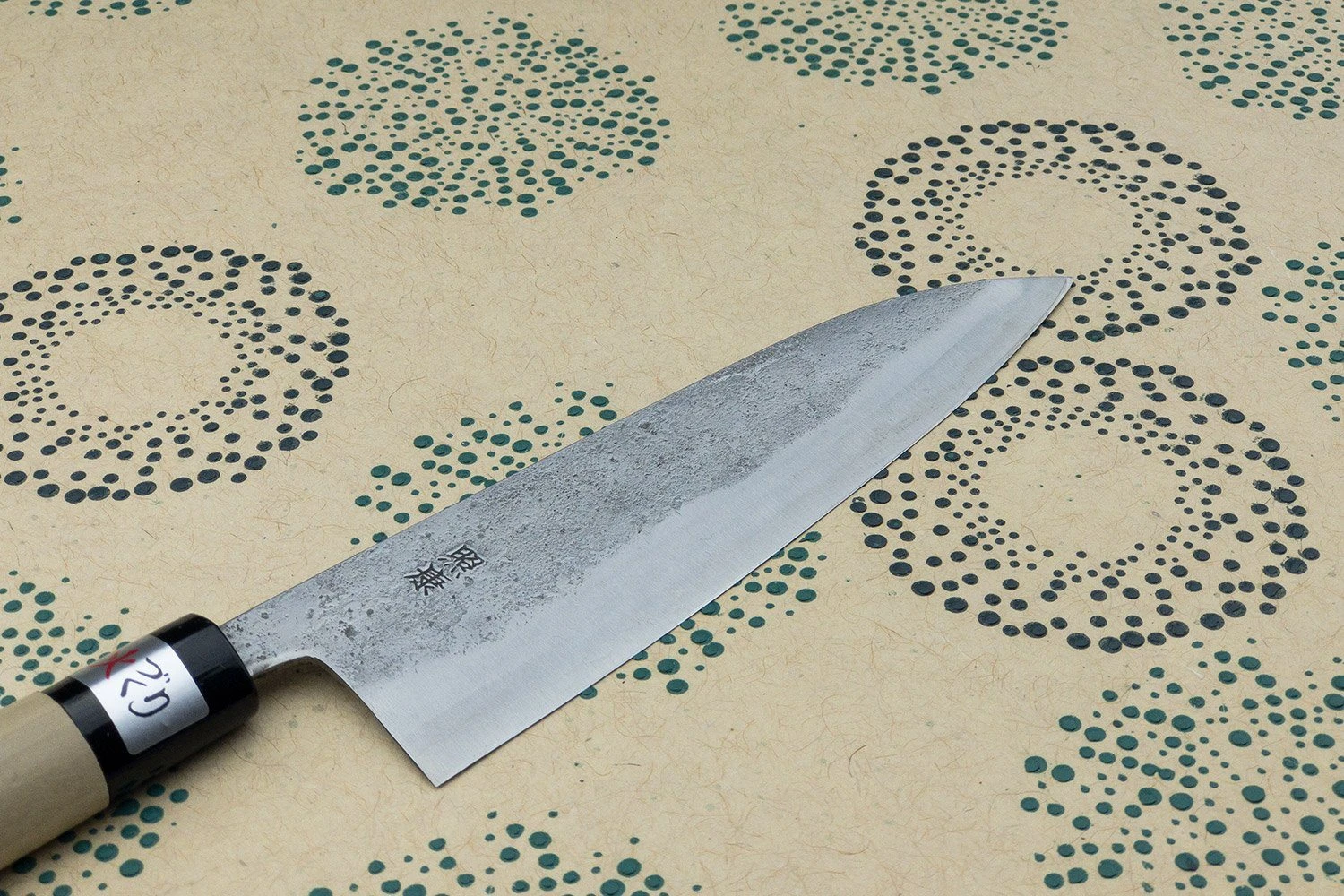 This blade is made from Shirogami steel, called ‘white carbon’ in English, and while it requires care to avoid rust, it gets sharper than just about any other knife steel out there. The rough ‘nashiji’ finish is inspired by the skin of an Asian pear and shows off the hard work and care that goes into making his knives.