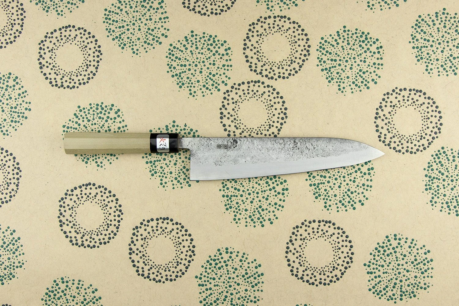 This blade is made from Shirogami steel, called ‘white carbon’ in English, and while it requires care to avoid rust, it gets sharper than just about any other knife steel out there. The rough ‘nashiji’ finish is inspired by the skin of an Asian pear and shows off the hard work and care that goes into making his knives.