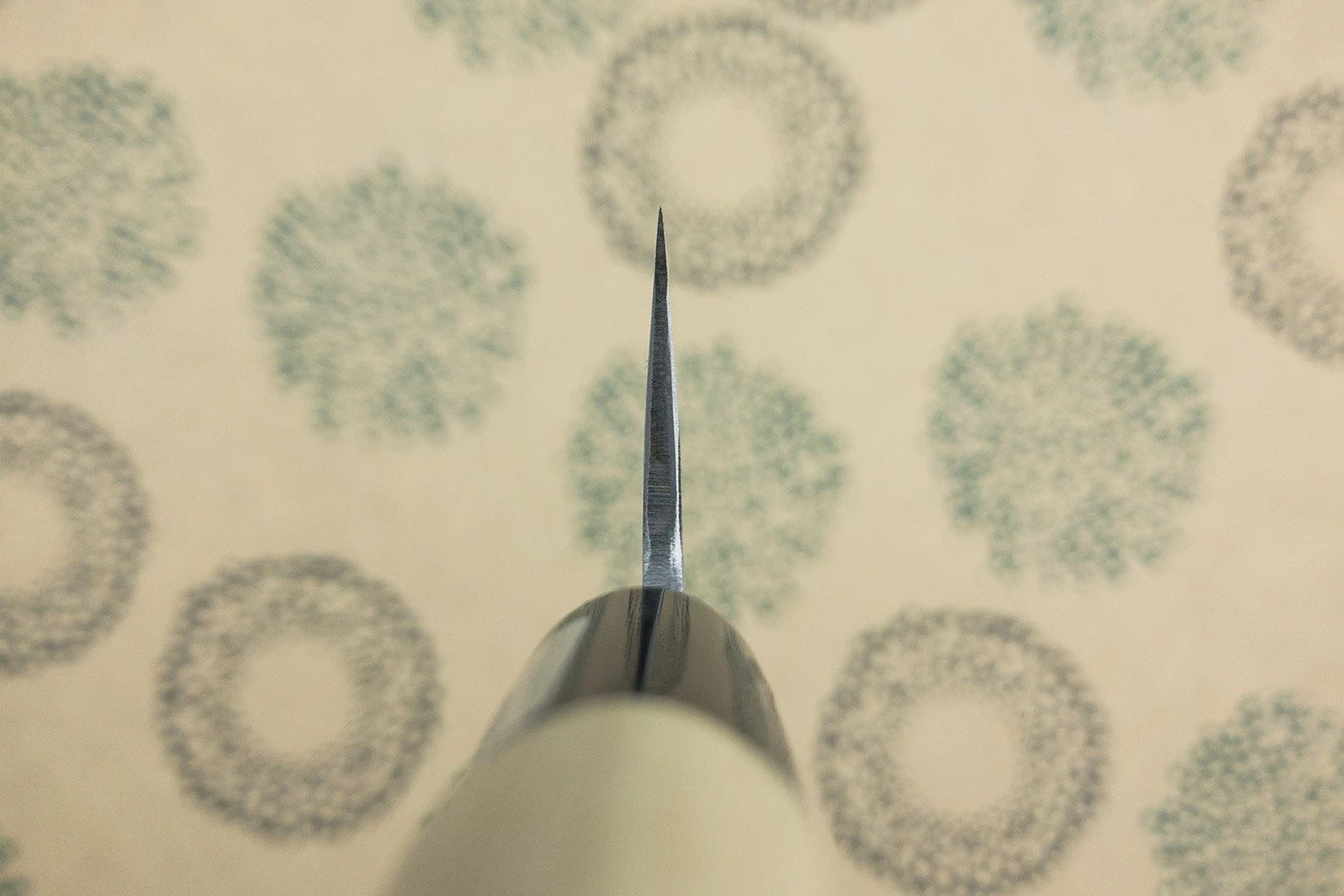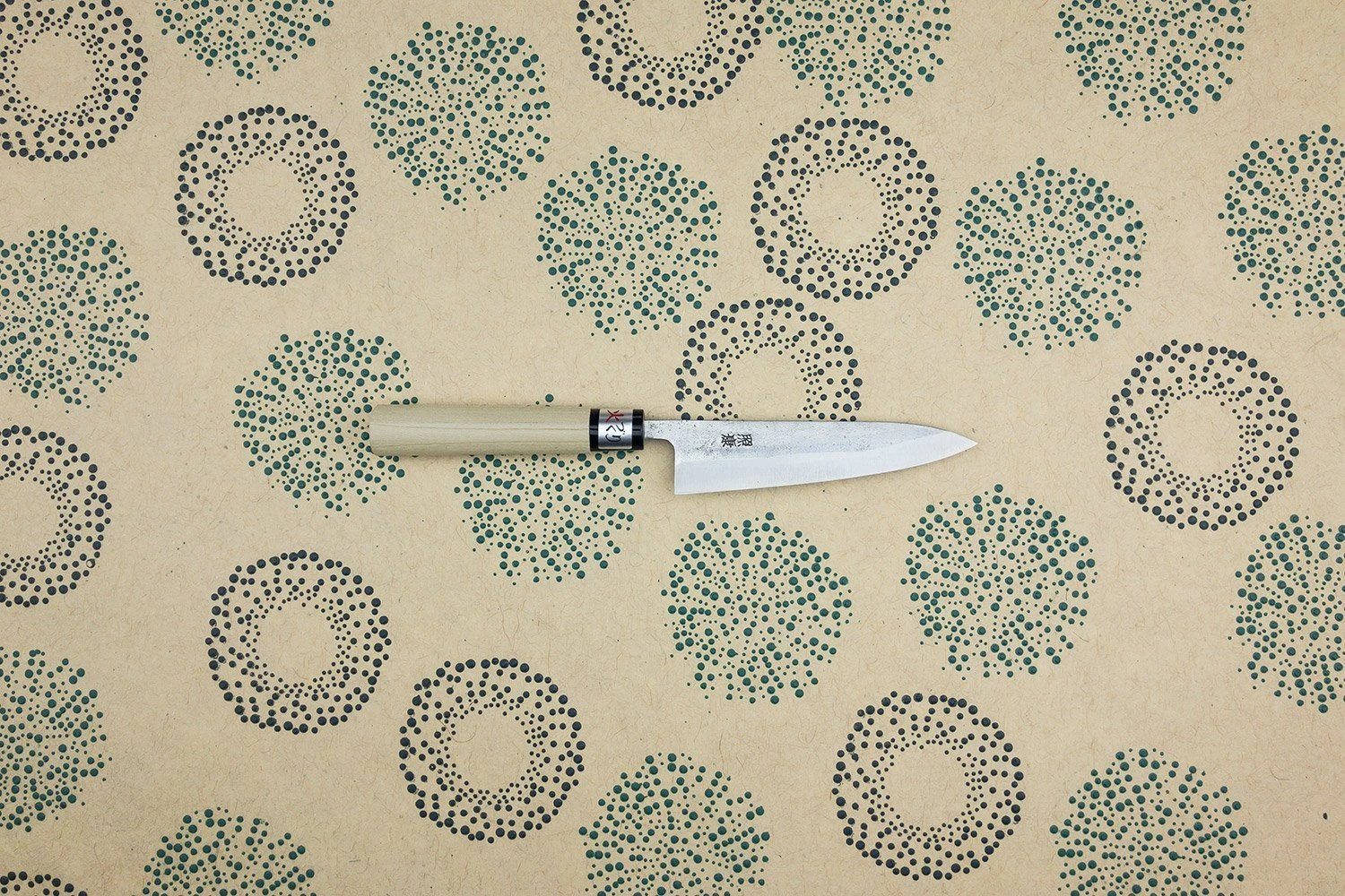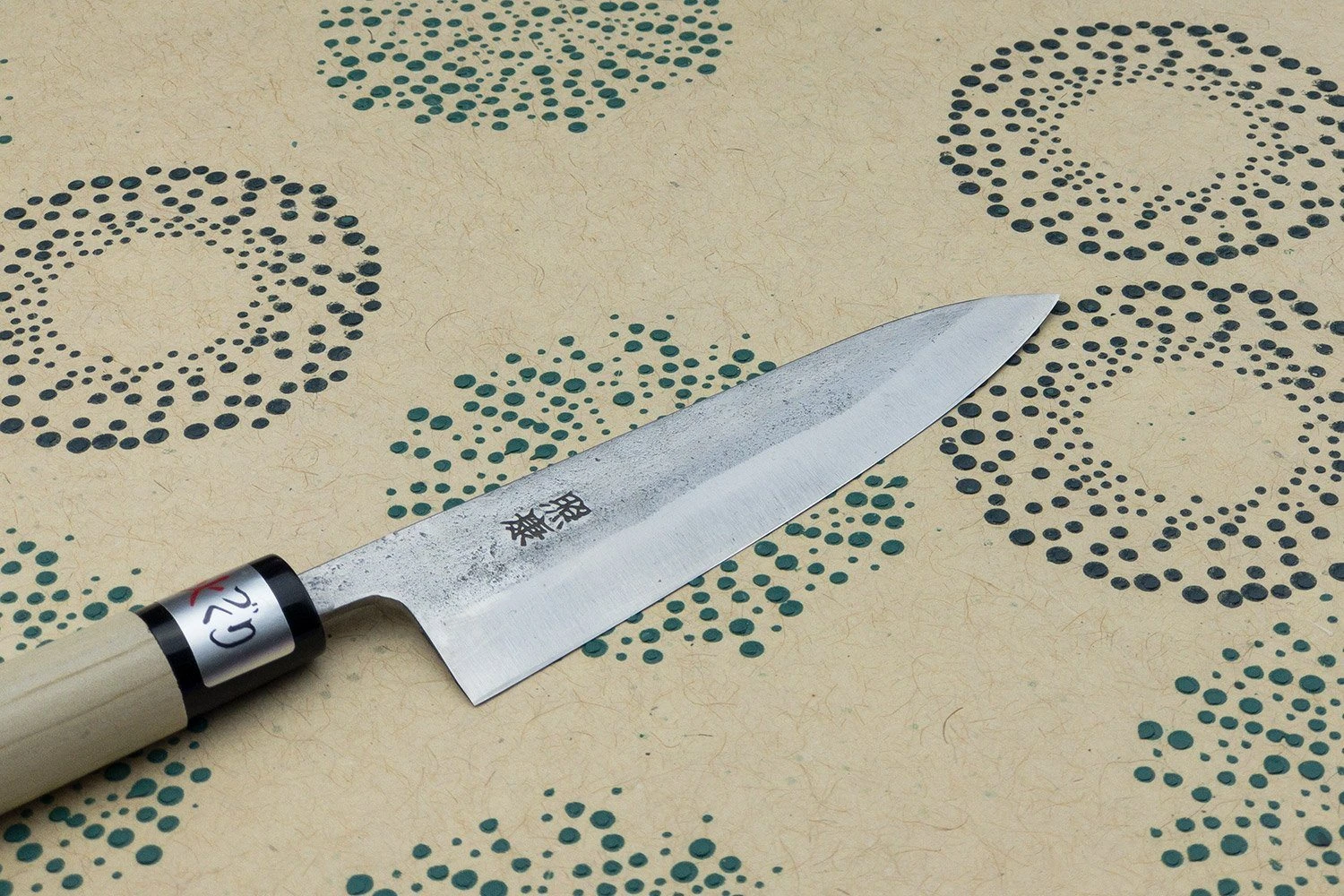 This blade is made from Shirogami steel, called ‘white carbon’ in English, and while it requires care to avoid rust, it gets sharper than just about any other knife steel out there. The rough ‘nashiji’ finish is inspired by the skin of an Asian pear and shows off the hard work and care that goes into making his knives.