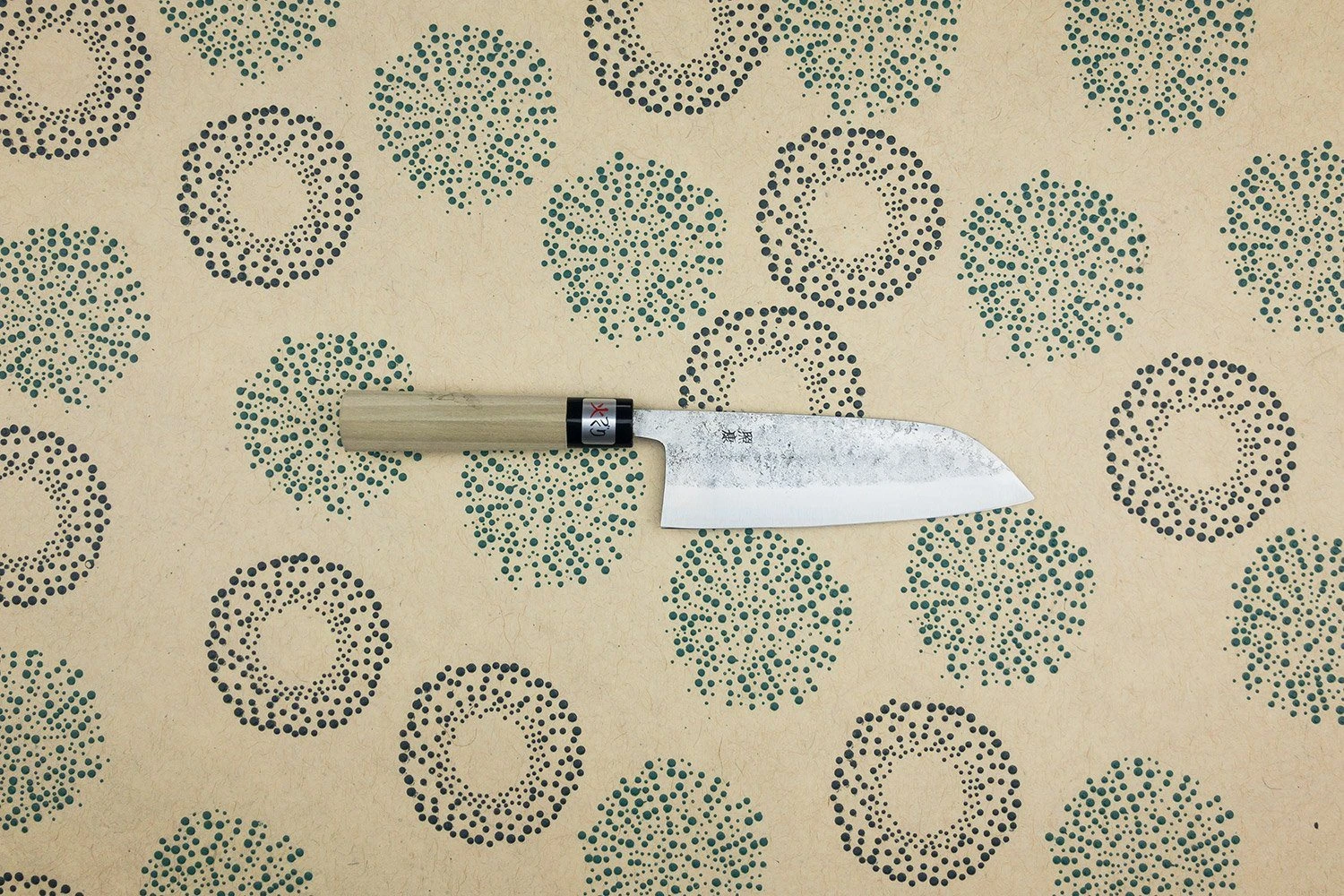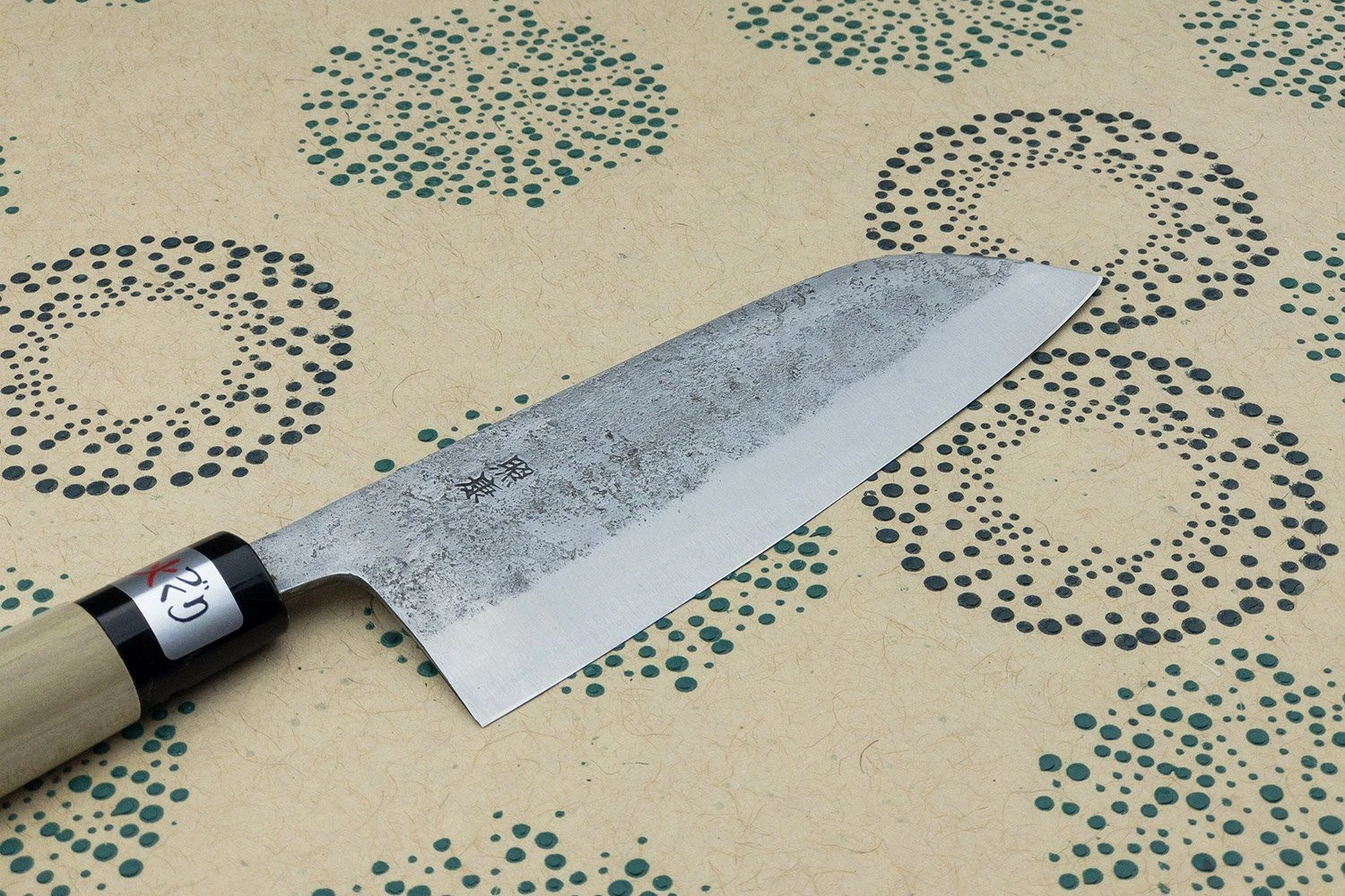 This blade is made from Shirogami steel, called ‘white carbon’ in English, and while it requires care to avoid rust, it gets sharper than just about any other knife steel out there. The rough ‘nashiji’ finish is inspired by the skin of an Asian pear and shows off the hard work and care that goes into making his knives.
