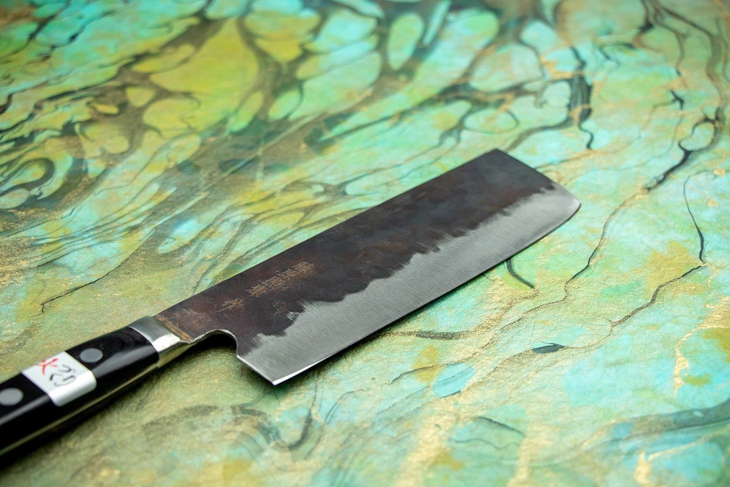 About the Shape A Nakiri is a vegetable knife. Under utilized in the Western kitchen, the Nakiri’s flat blade is meant for the push/pull chopping of vegetables. Since the entire flat edge of the knife kisses the cutting board at once, you wont be turning the vegetable into an accordion. Accordion vegetables are still connected like a paper doll after you’re “done” cutting them. To truly understand the awesomeness of a Nakiri we recommend making onion soup your first night with the knife. The ease of chopping will blow you away.