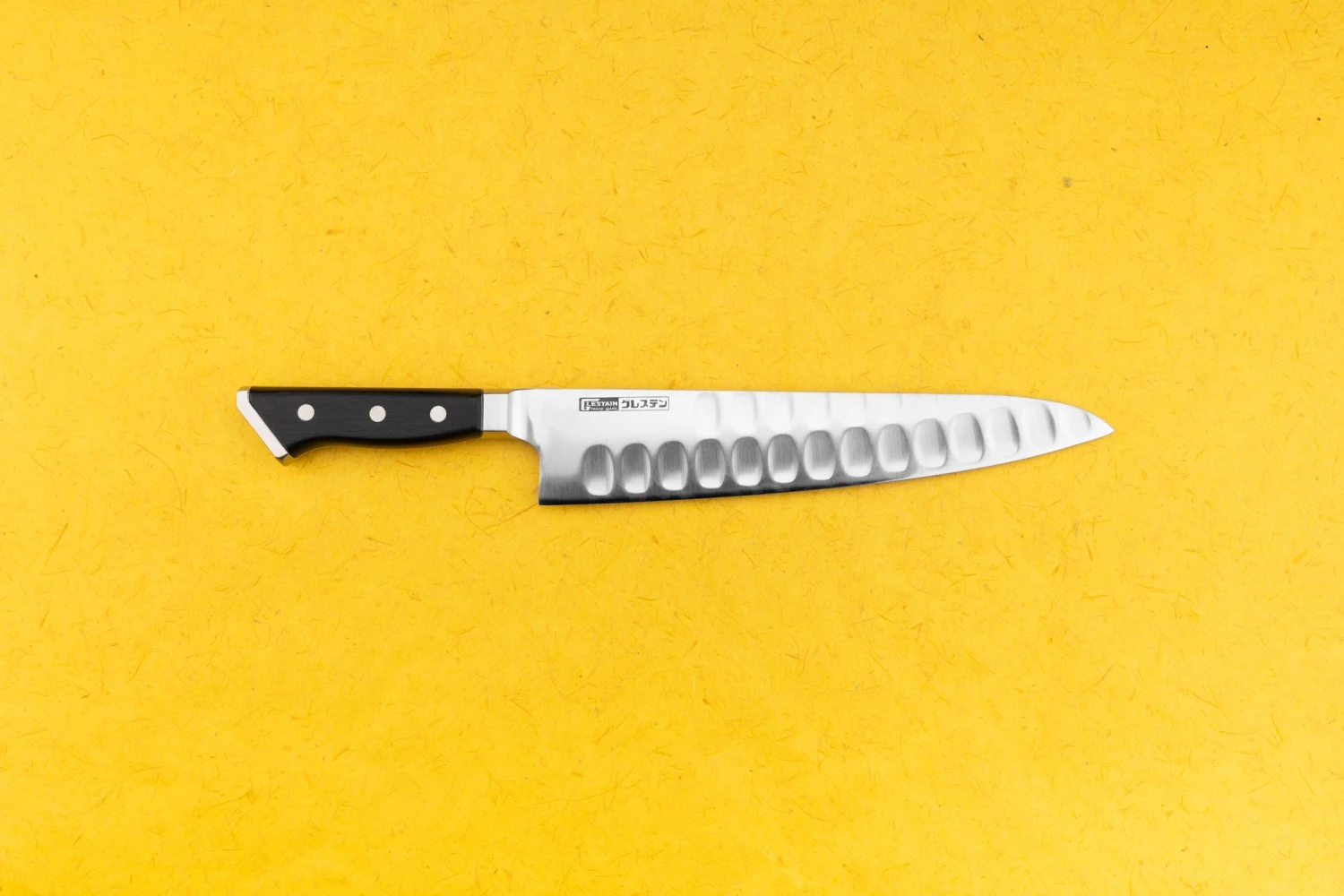 This is one of the best-engineered knives I’ve ever seen. The geniuses behind Glestain set out to design the ultimate kitchen knife for professionals, and they struck gold. A big problem for fast-chopping cooks and chefs is food piling up on the blade, and this knife tackles the issue two ways: deep dimples break the surface tension on the blade, while a pronounced bevel on one side pushes the food over. Genius! The knife is right-handed and will want to steer slightly to the left, but with a little practice, you’ll be chopping at high speed with the best of them.