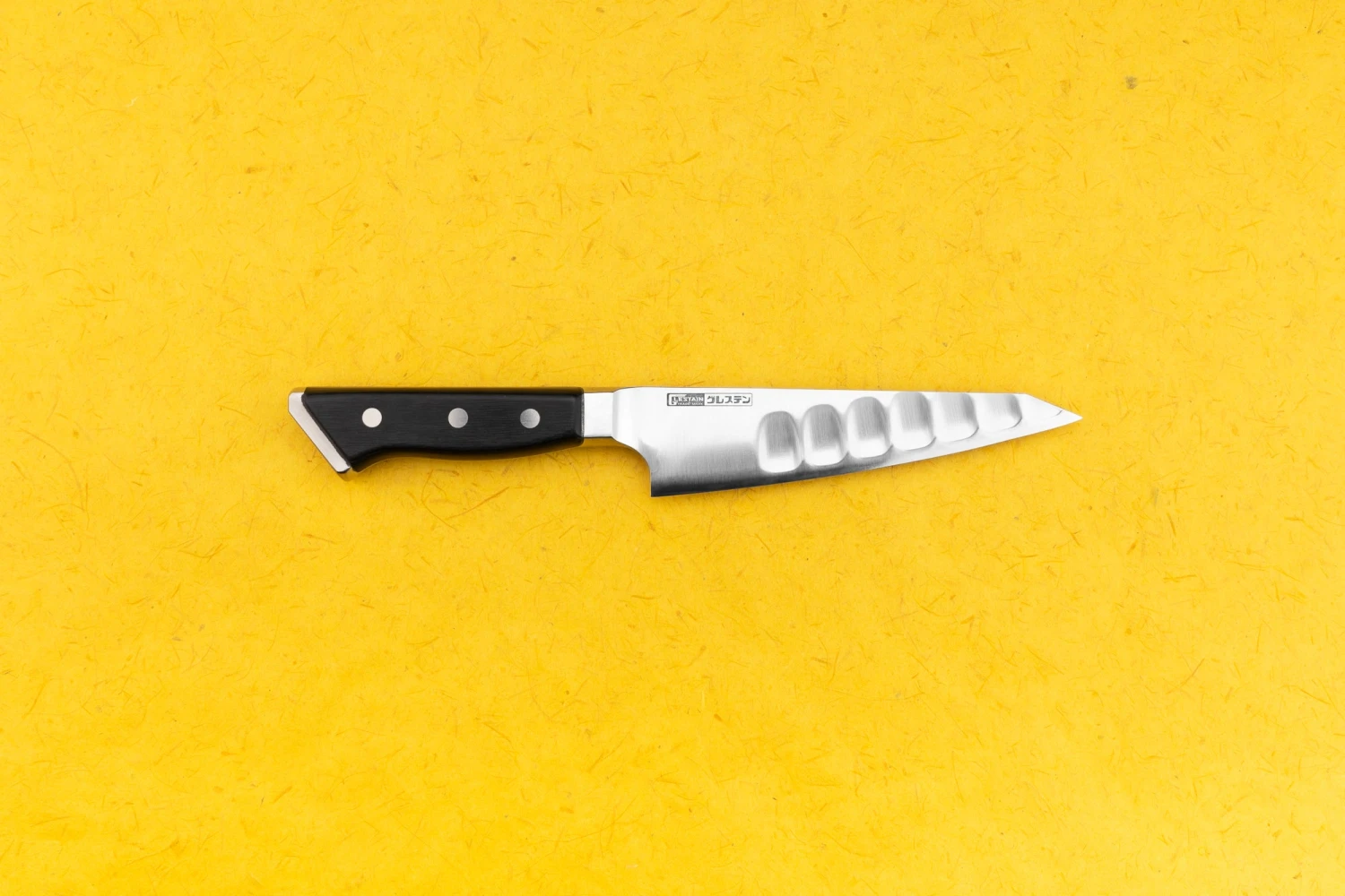 About Glestain K-series – This is one of the best-engineered knives I’ve ever seen. The geniuses behind Glestain set out to design the ultimate kitchen knife for professionals, and they struck gold. A big problem for fast-chopping cooks and chefs is food piling up on the blade, and this knife tackles the issue two ways: deep dimples break the surface tension on the blade, while a pronounced bevel on one side pushes the food over. Genius! The knife is right-handed and will want to steer slightly to the left, but with a little practice, you’ll be chopping at high speed with the best of them.