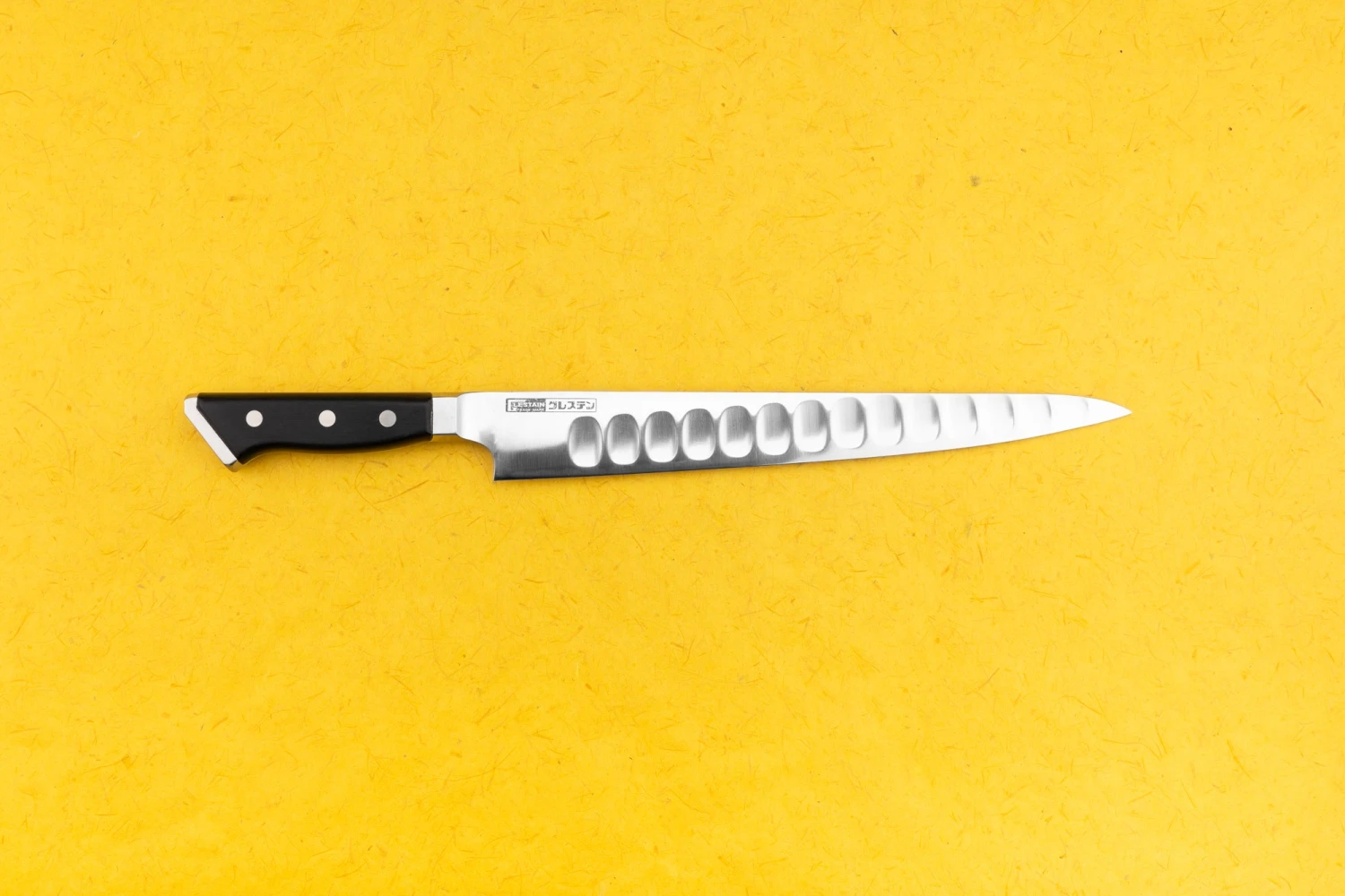 This is one of the best-engineered knives I’ve ever seen. The geniuses behind Glestain set out to design the ultimate kitchen knife for professionals, and they struck gold. A big problem for fast-chopping cooks and chefs is food piling up on the blade, and this knife tackles the issue two ways: deep dimples break the surface tension on the blade, while a pronounced bevel on one side pushes the food over. Genius! The knife is right-handed and will want to steer slightly to the left, but with a little practice, you’ll be chopping at high speed with the best of them.