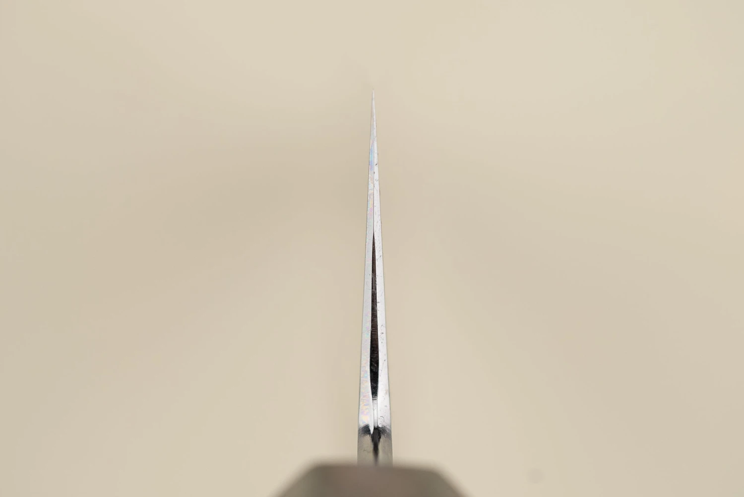 The perfection doesn’t stop at Nomura-san’s sharpening and polishing. These blades are forged by the legendary Yoshikazu Tanaka-san from Shirogami #1, white carbon steel clad in protective stainless steel. That means they cut like lightning, but only a few mm of steel at the edge can rust. Mind-blowing performance with relatively low maintenance. The simple oak handle is the perfect complement to this rockstar of a knife.