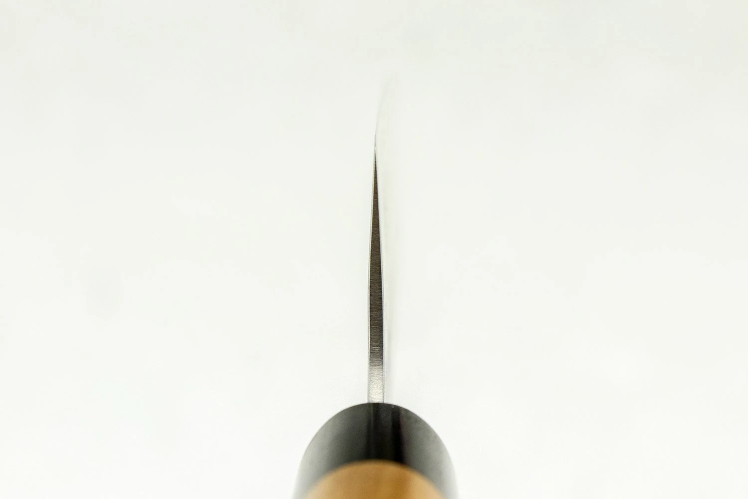 The Haruyuki Kokuto is forged from a modern high-tech stainless steel called Ginsan, which was specially designed to cut much like traditional Japanese high-carbon steel without being a rusty pain in the butt! You get the joy of cutting with a traditional Japanese knife but none of the fussy maintenance. Truly, the best of both worlds.