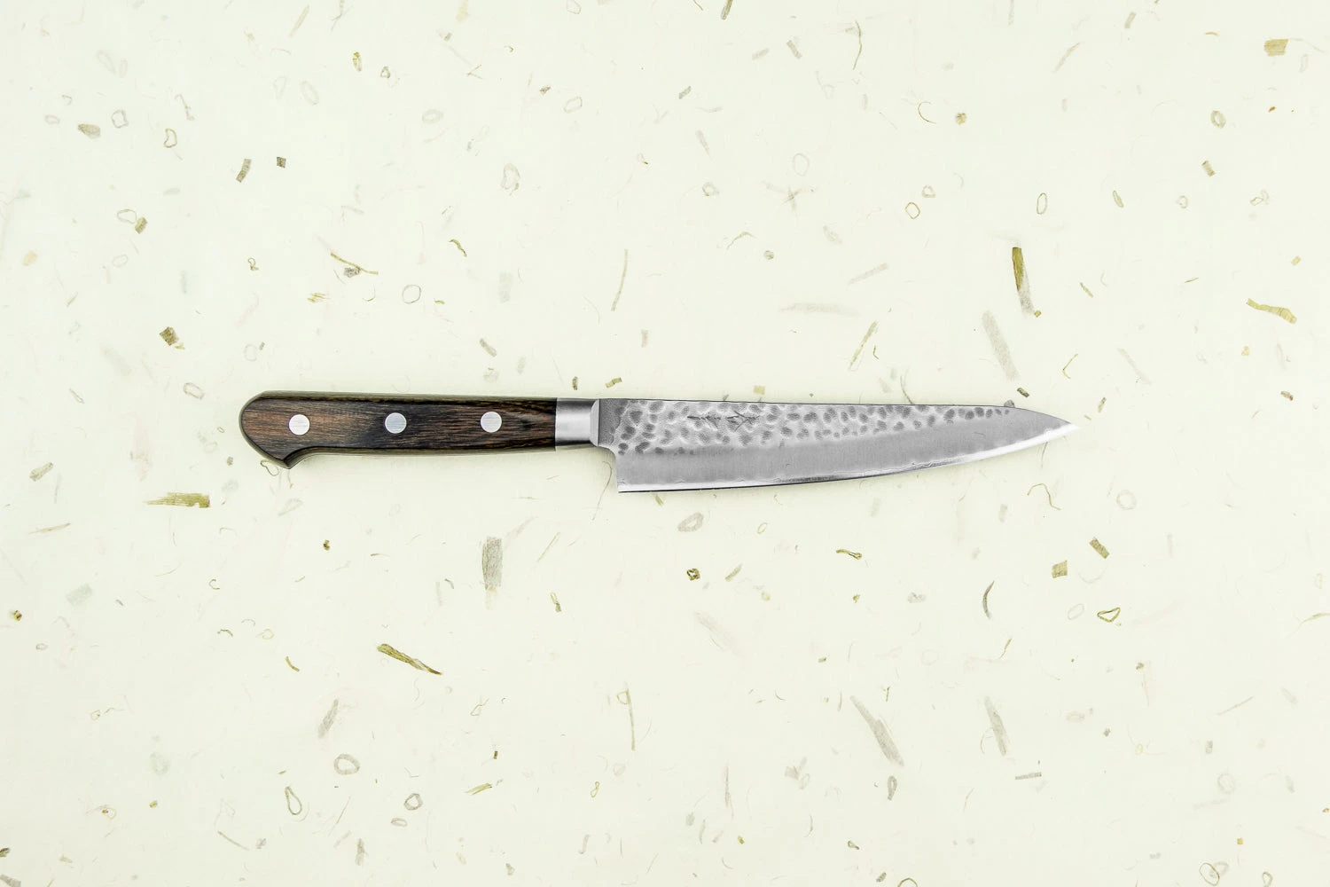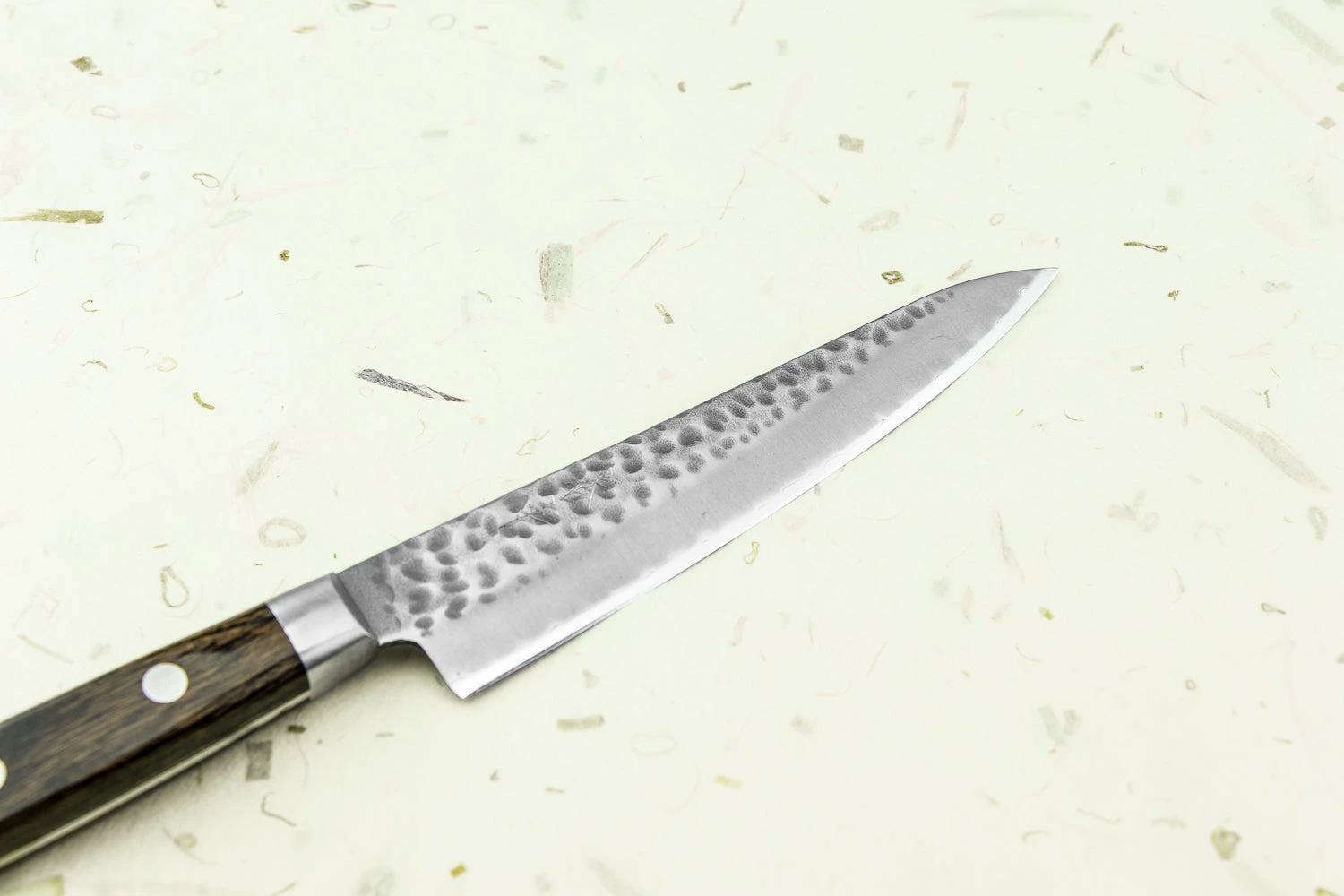 About Haruyuki Mugi –These knives are the perfect gateway into Japanese knives and make a perfect gift. They look great, have a familiar feel because of the western style handle and the performance of the steel will blow you away. The hammered surface will break up surface tension allowing the knife to glide easily through the food as you slice and dice.