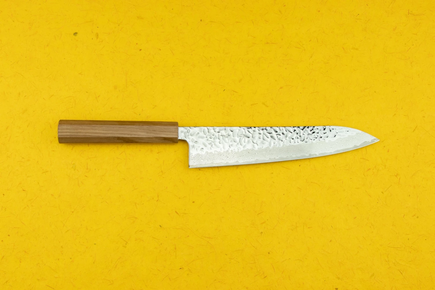 This stunning blade sports a hammered ‘tsuchime’ finish that transitions to a polished bevel with layers of damascus steel. The word ‘Nagisa’ refers to the point where waves crash onto the beach, inspired by the intersection of the damascus and tsuchime patterns. I love this Japanese ‘wa handle’ because it focuses all of the knife’s weight into the blade. This lets it do more of the work for you, so slicing up a pile of veggies feels like no big deal.