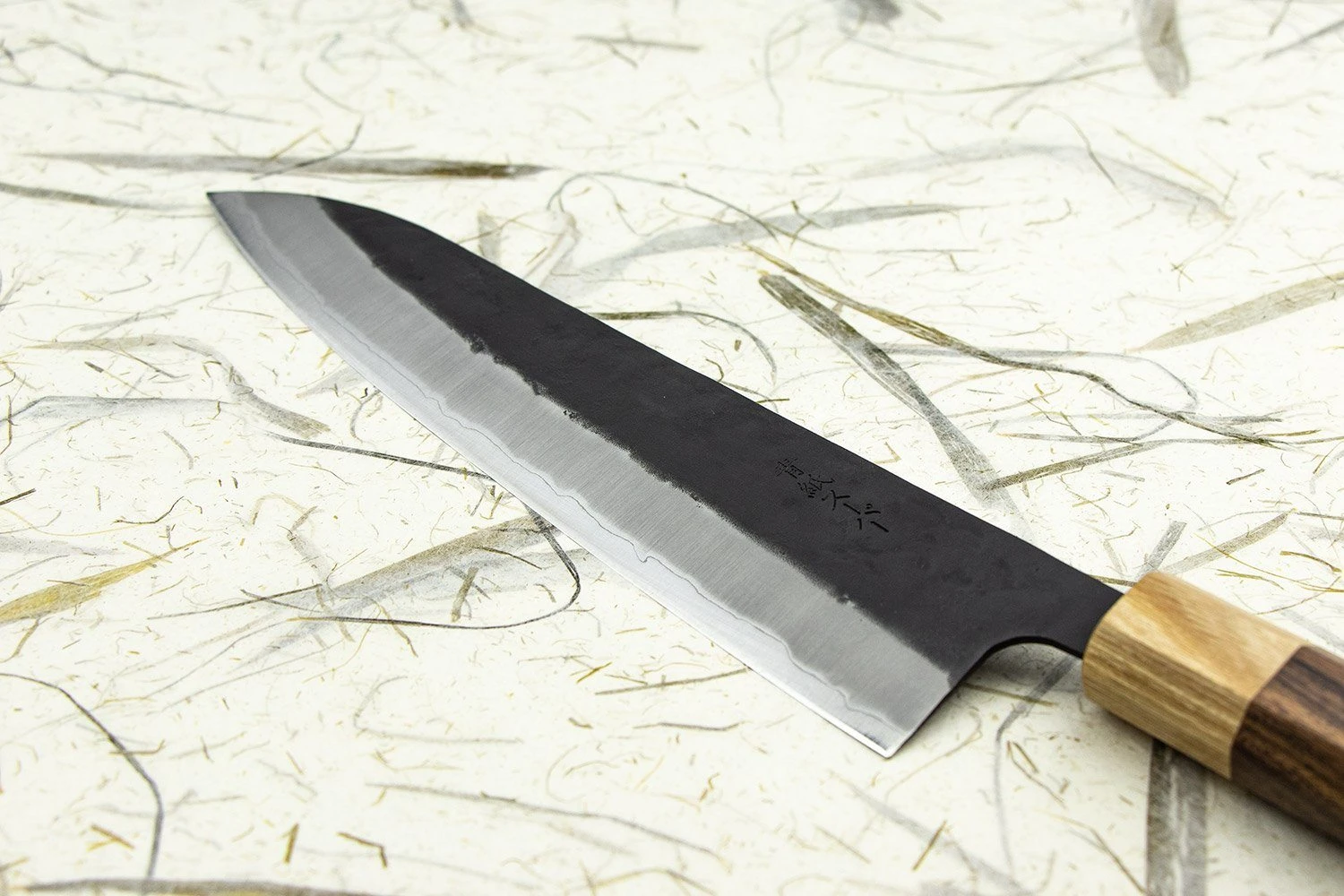 Aogami Super is the king of knife steel—super easy to sharpen, gets a laser beam edge, cuts like silk, and isn’t as fussy as other carbon steels. It’s then clad in stainless steel, so only the edge needs to be kept dry to avoid rusting. Brilliant. If that wasn’t enough, they’ve given it this black ‘kurouchi’ finish, which makes for a seriously badass blade. The two-tone handle compliments the overall look of the blade so well and really makes this a knife worth showing off!