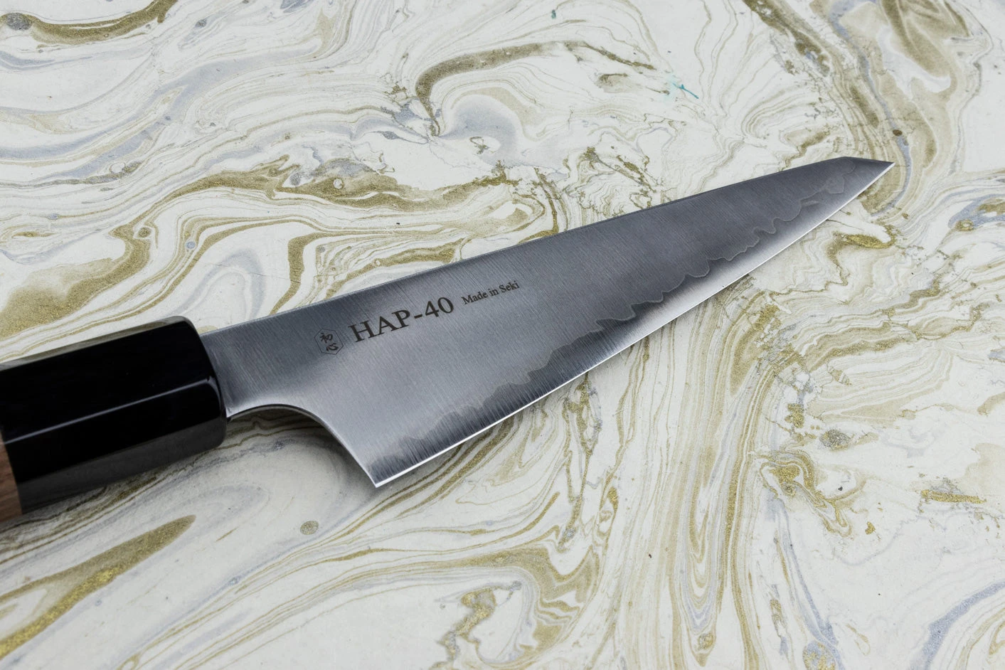 About Hatsukokoro Hayabusa – This unique line of knives is made by a number of talented knife makers, including San-Etsu hamono in Seki. The HAP40 line is simple, slick and just works like a charm. HAP40 high speed powder steel, which can attain a Rockwell Hardness of 67+. In layman’s terms, it’s insanely hard steel that gets wicked sharp and holds an edge like nothing else.