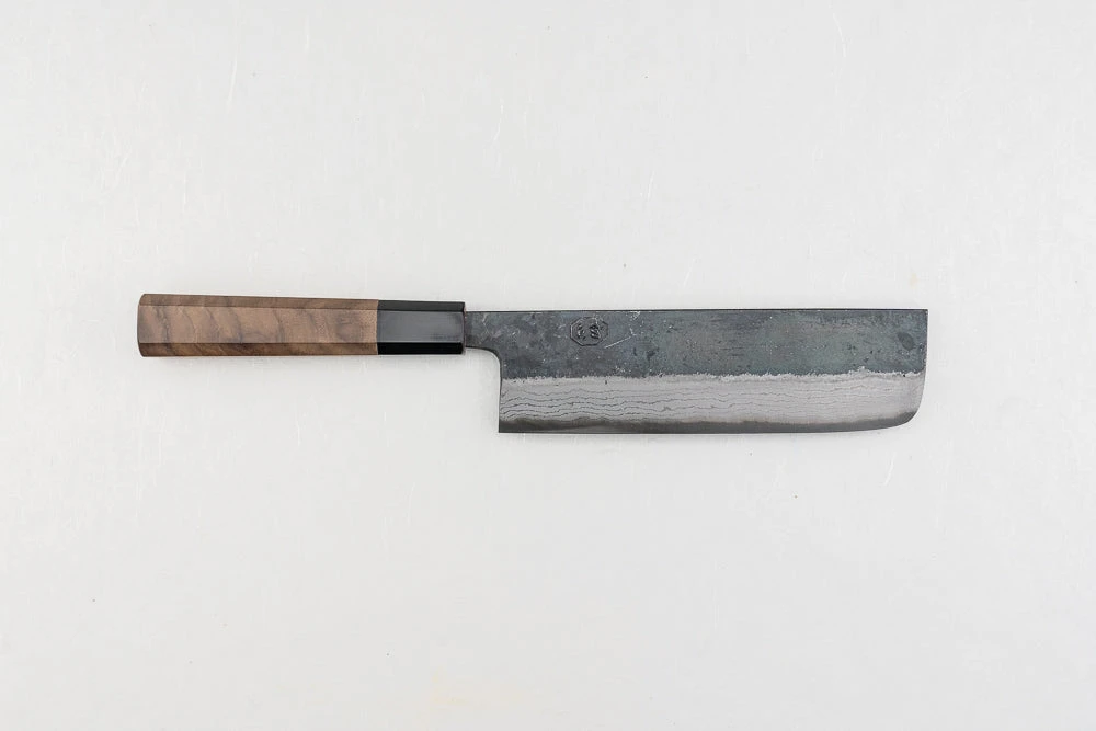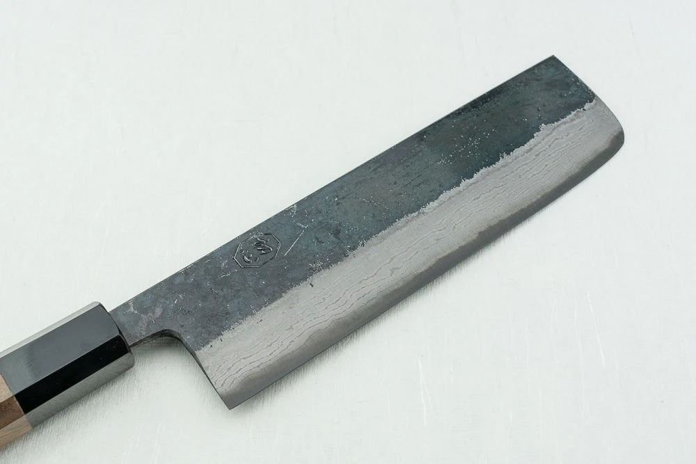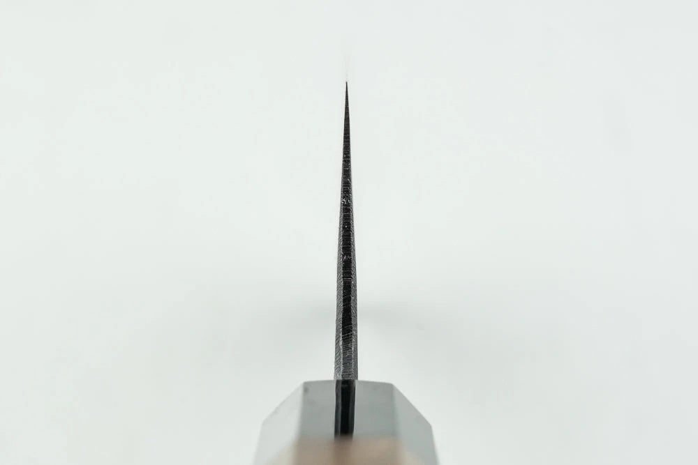 About Hatsukokoro Kumokage –Hatsukokoro works with a wide variety of artisans in their local area, from blacksmiths to knife sharpeners and handle makers. By working with folks who have mastered their craft, each aspect of the knife is carefully curated. Their Kumokage line offers the high-end performance and good looks that Japanese carbon steel is known for, at an incredibly agreeable price. With a little extra care, blue carbon steel gets incredibly sharp and keeps a spectacular edge. The dark wood handle gives it an elegant look, while the octagon shape is exceedingly comfortable to hold while you cut.