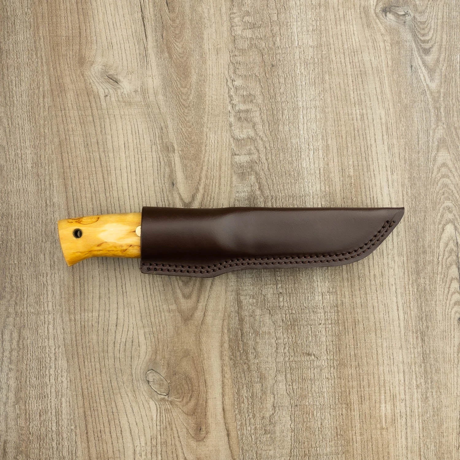 Perhaps the ultimate bush knife, the Helle Temagami was designed by Survivorman Les Stroud, with survival in mind. A full-tang design makes a sturdier knife that can take more abuse than most Helle knives, and the finger guard keeps it safe and secure while performing bushcrafting jobs. By using stainless steel, this knife will be easier to maintain than its carbon steel twin.