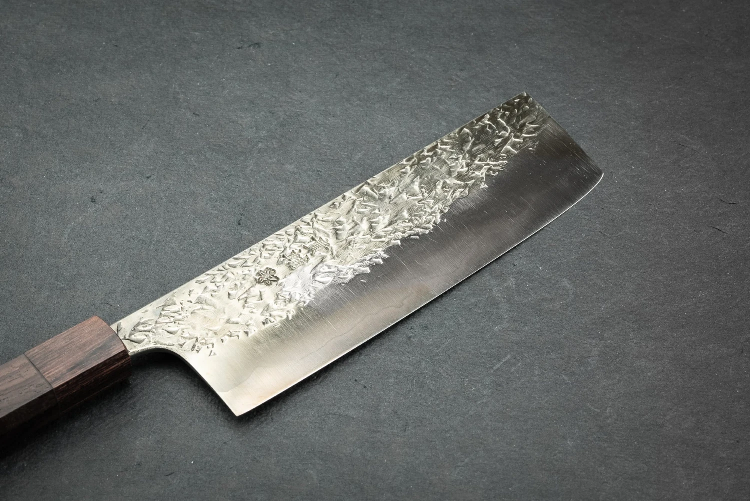 About the Shape – A Nakiri is a vegetable knife. Under utilized in the Western kitchen, the Nakiri’s flat blade is meant for the push/pull chopping of vegetables. Since the entire flat edge of the knife kisses the cutting board at once, you wont be turning the vegetable into an accordion. Accordion vegetables are still connected like a paper doll after you’re “done” cutting them. To truly understand the awesomeness of a Nakiri we recommend making onion soup your first night with the knife. The ease of chopping will blow you away.