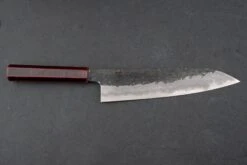 About Manaka Hamono – Kisuke Manaka is a relatively young, 5th generation, blacksmith in Kasukabe, Saitama pref. Manaka-san didn’t like the dishonest way his father-in-law operated his business so he decided to become a blacksmith himself. He began making knives from scratch about 10 years ago, with nothing but a workshop full of equipment and no mentor. He is completely self-taught, yet he mastered techniques to forge-weld steels in house, even forge welding stainless steel which is no easy task.