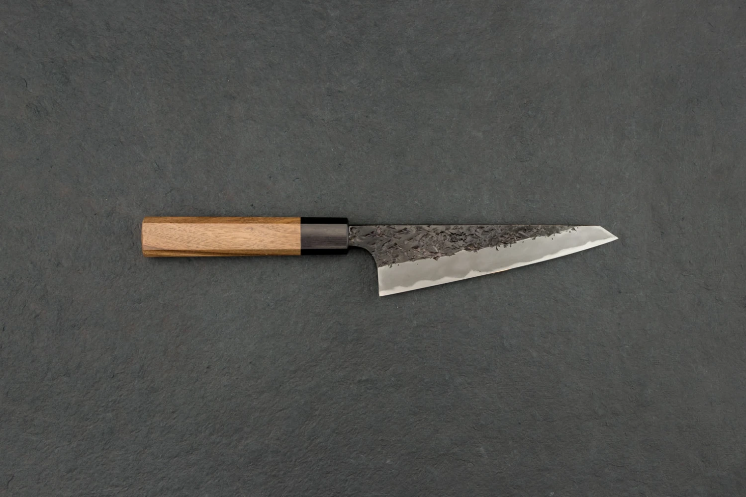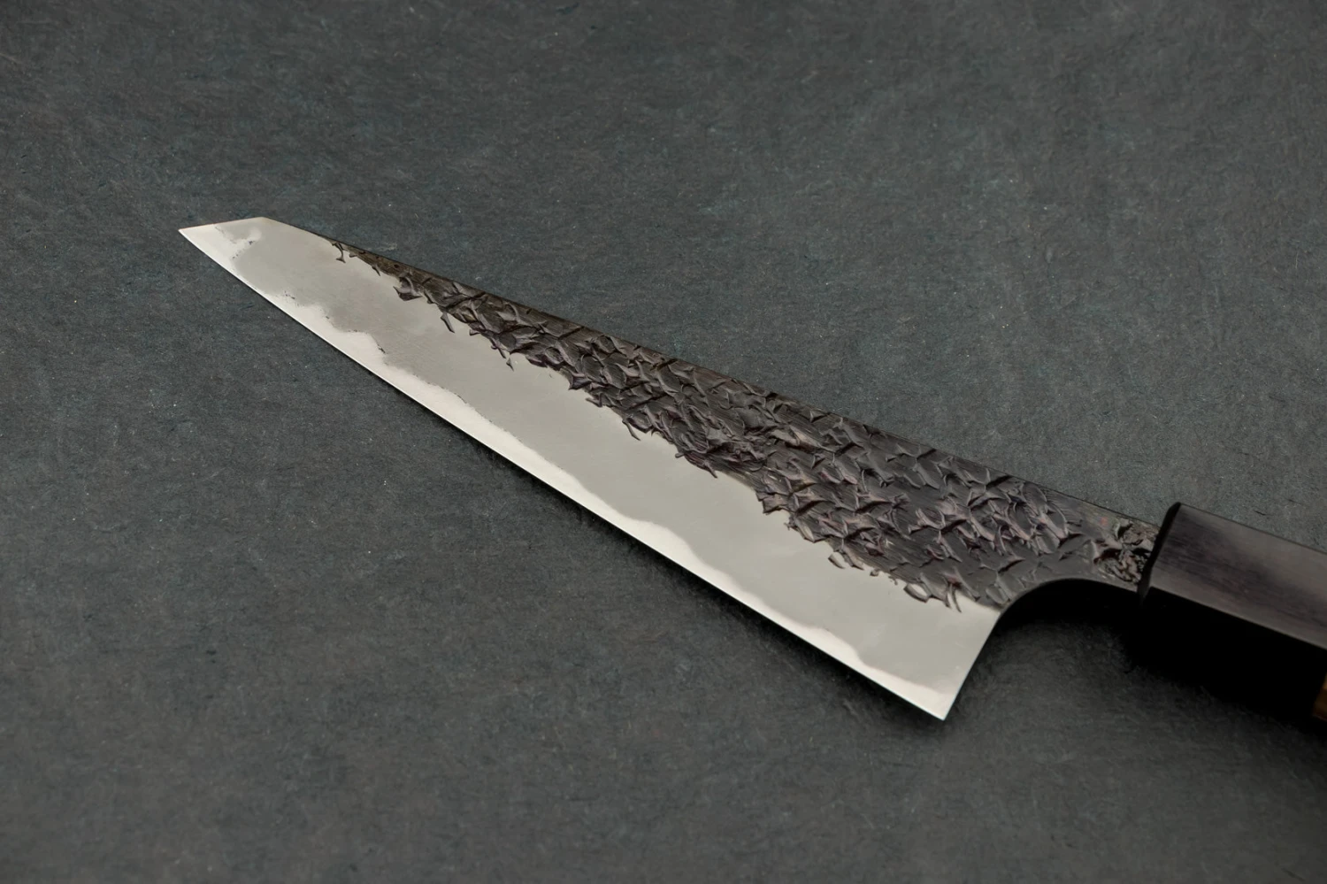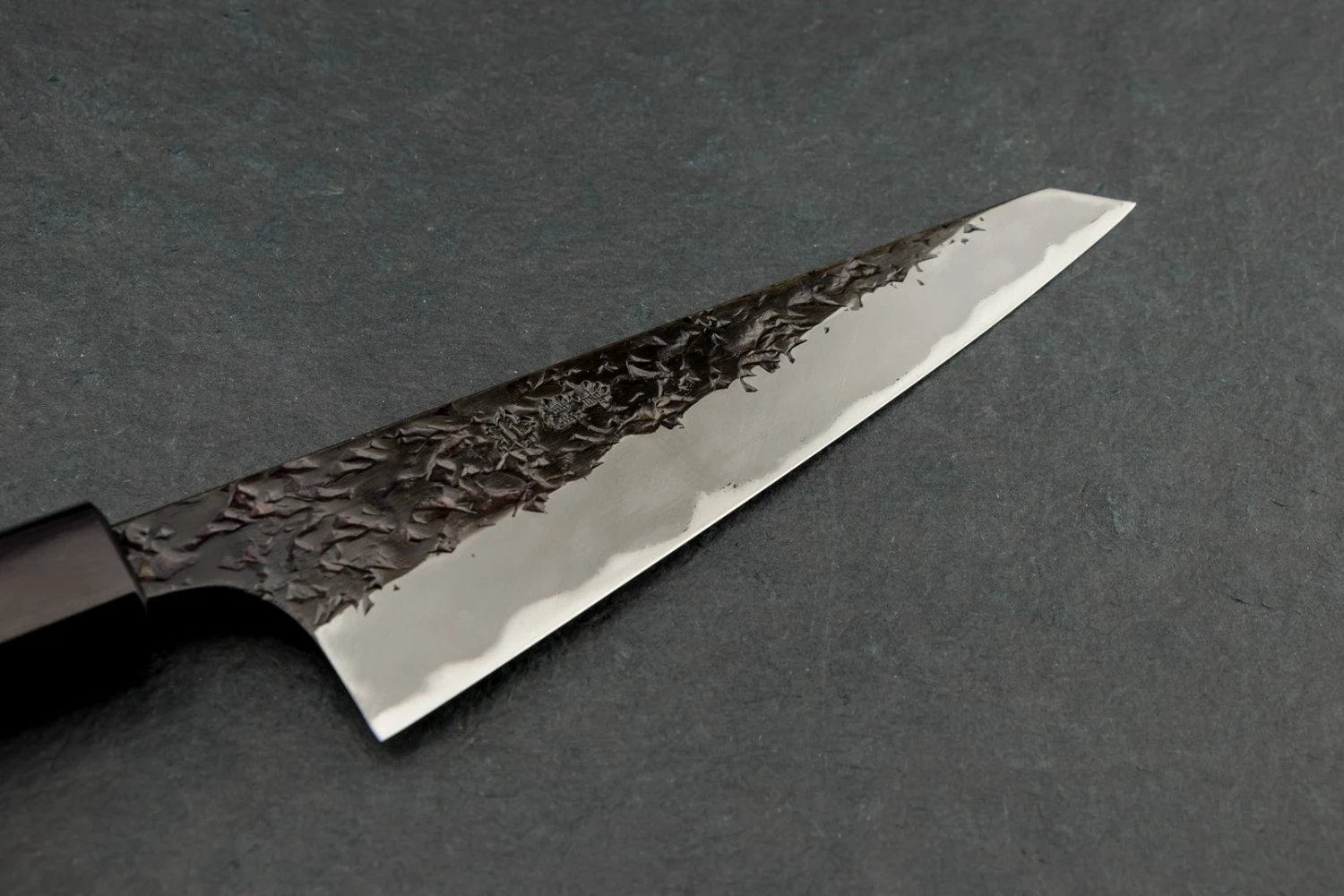 Now he forge-welds everything in house, from hard carbon steel clad with soft steel, stainless steel clad with stainless, and carbon steel clad with stainless steel. The Shirogami #2 steel used in these knives is forge-welded in house by Manaka-san. This is a very traditional steel that can achieve incredible sharpness and has great edge retention, a favourite of more traditional blacksmiths.