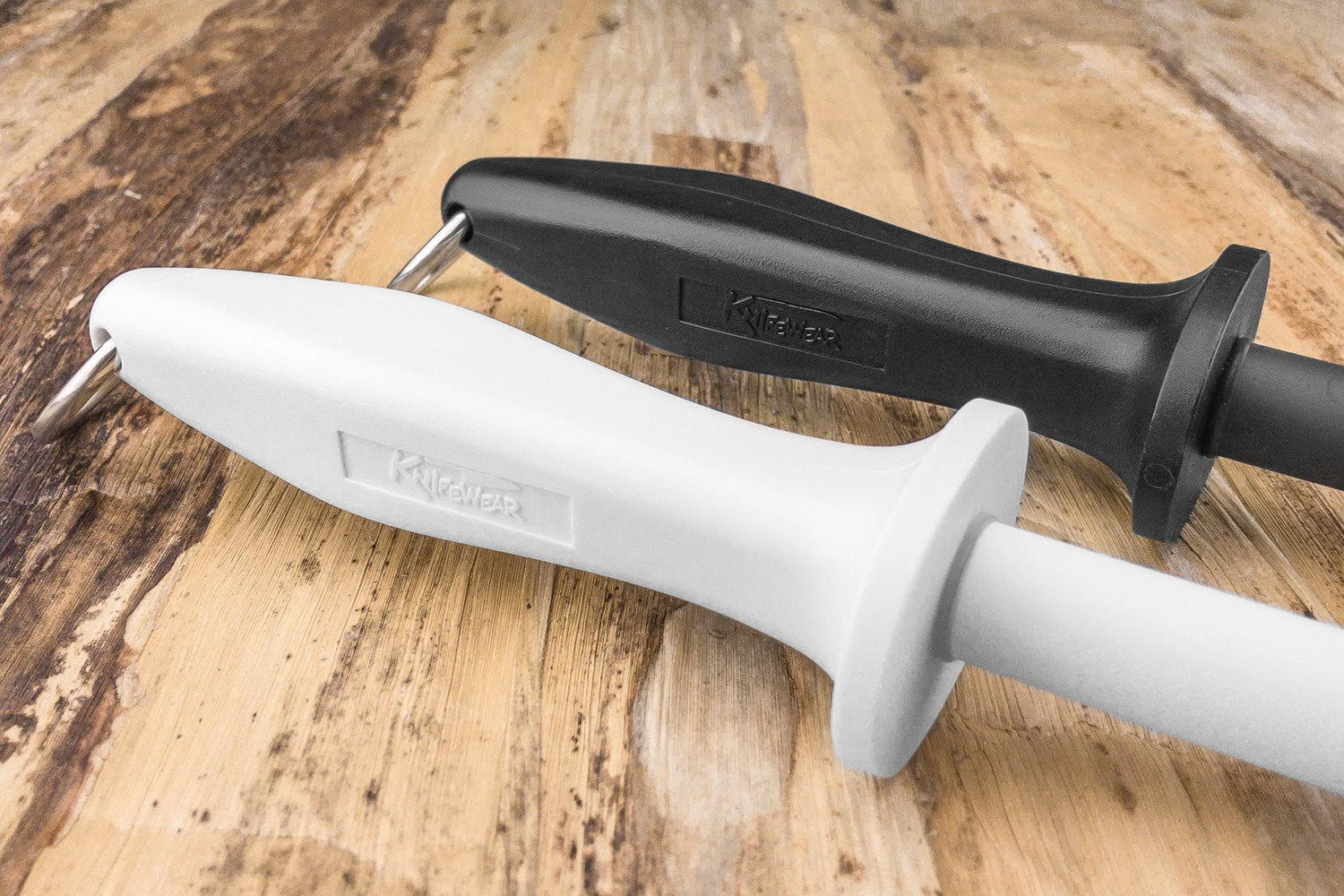 This white honing rod is super hard (9 on the Mohs Scale), and a little coarser. Perfect for maintaining blades that get a serious workout! We love this white honing rod when sharpening because it does an awesome job of cleaning the burrs off an edge. The texture is roughly equivalent to 4000-6000 grit, slightly coarser than the black rod.