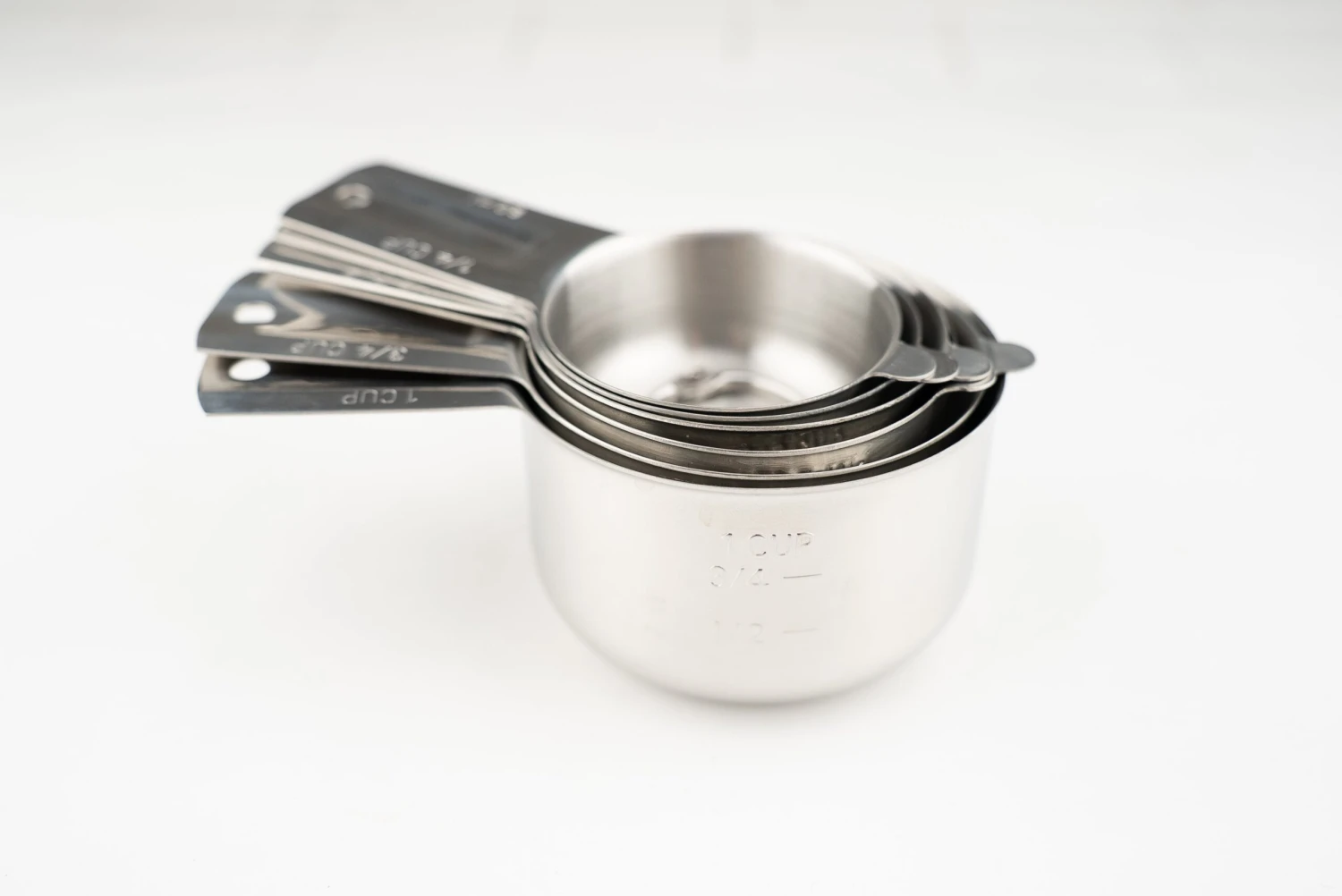 The best cup set for baking & cooking! These solid steel cups nest for easy storage, and feature measurement lines for smaller sizes on their interior.
