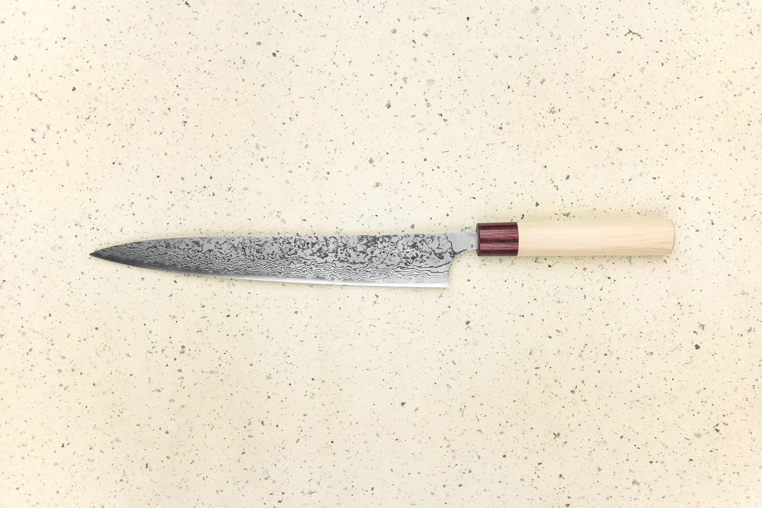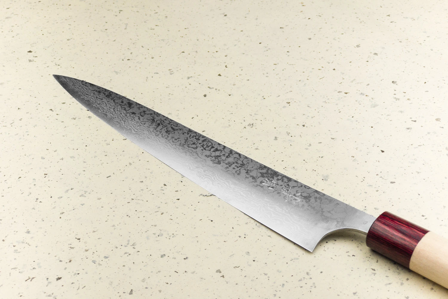 When you first pick up the Kiri, you’ll notice just how light it is. The steel is hammered thinner than your average knife, which lets it fly through dense foods like potatoes and squash with ease. This knife is hand-forged from VG10, a high-carbon stainless steel that gets wildly sharp and holds an excellent edge without requiring much maintenance. The VG10 core steel is laminated with stunning layers of damascus steel, which, combined with the red and white Japanese wa handle, make for a STUNNING knife. Truly, usable art!