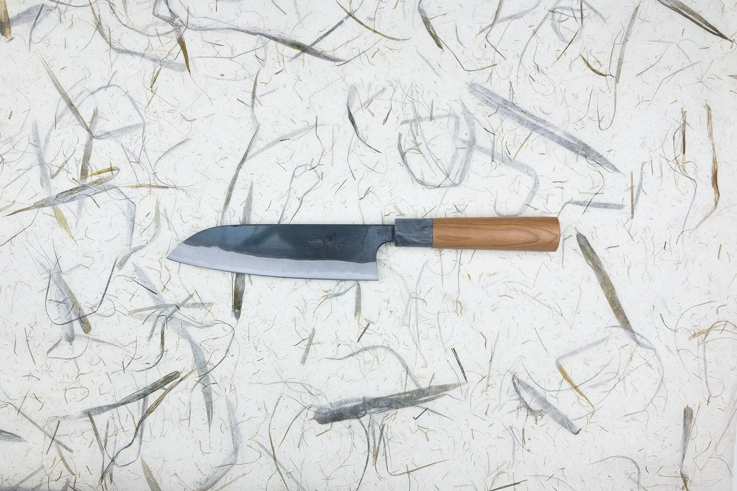 The rustic Mizu series really shows off the beauty that traditional carbon steel is known for. Translating to ‘water’ in Japanese, this collection’s name is inspired by the deep bluish-black ‘kurouchi’ finish. I’ve always loved carbon steel because it cuts like a dream, and when you use the knife, you can almost feel the heart and soul of the blacksmith in your hand.