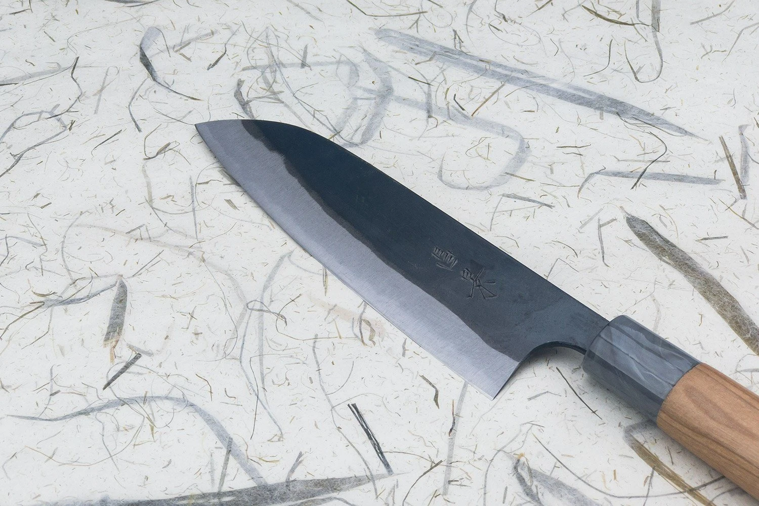 About the Shape – This is also a multi purpose knife, but with a slight vegetable bias. Santoku means ‘Three Virtues’ or ‘To solve Three Problems’. The virtues or problems are slicing, dicing and mincing. Santoku is usually found in 160mm – 190mm lengths. These are more and more popular in Western kitchens due to the unique shape and smaller easy to handle size.