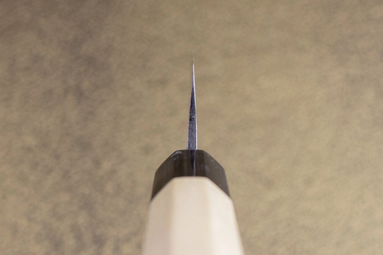 This line was dubbed Shimo (‘frost’ in Japanese) because Kurosaki-san can manipulate his damascus steel to create X-shape patterns that resemble frost on a window. Shirogami, or ‘white carbon’ in English, is a very traditional steel prized by blacksmiths and knife nerds alike for its great edge retention and legendary sharpness. The stark black and white handle is really the icing on the cake that completes the eye-catching design of this knife.