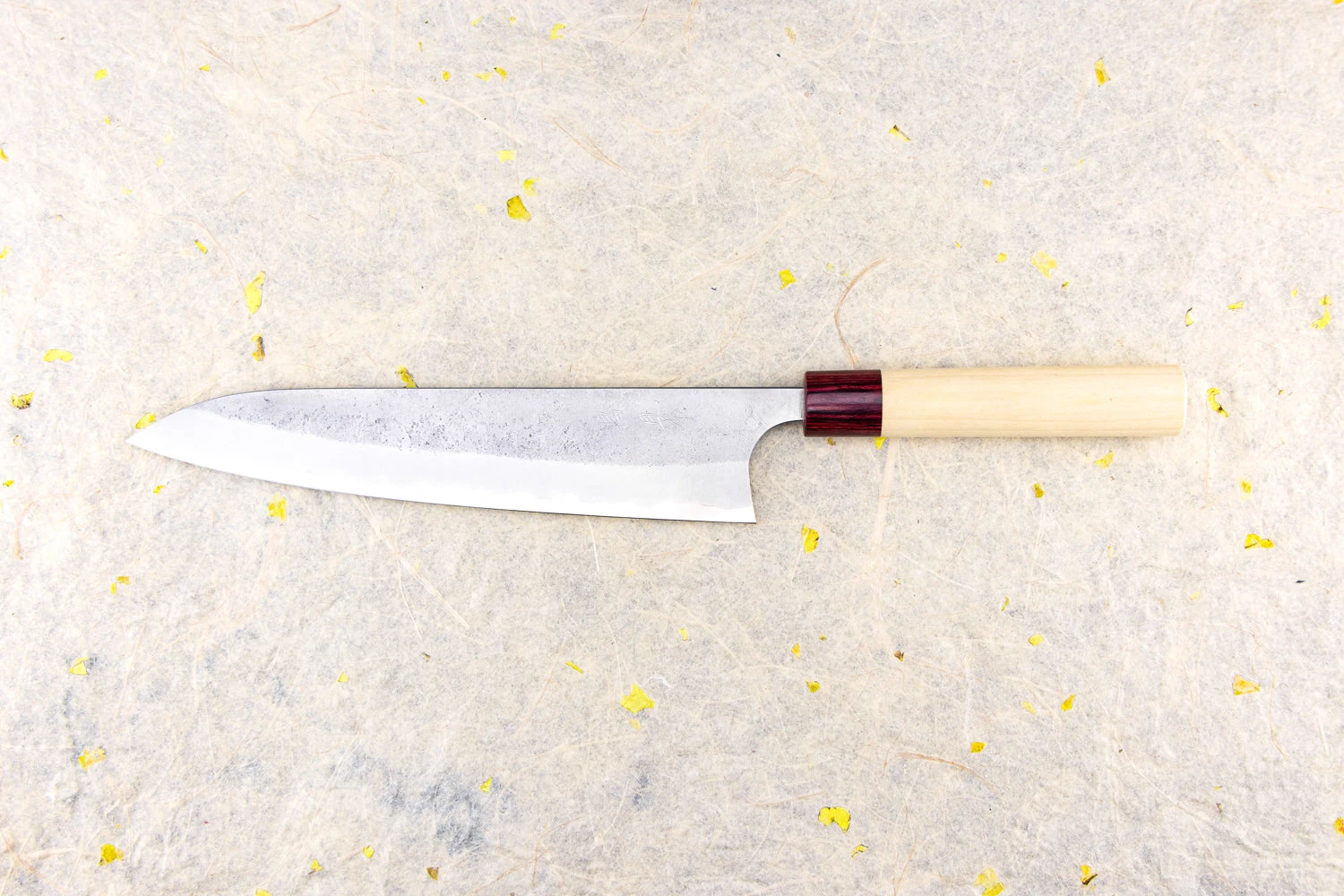 About the Shape – Inspired by the profile of a traditional European chef knife, Gyutos are a multi purpose knife with a slight meat cutting bias. “Gyuto” translates to “cow sword.” If you want one knife to do it all, This is it. Starting at 180mm, Gyutos can reach the ridiculously long (and awesome) 370mm. For the at-home or professional cook, we recommend a Gyuto which measures between 210mm and 270mm long.