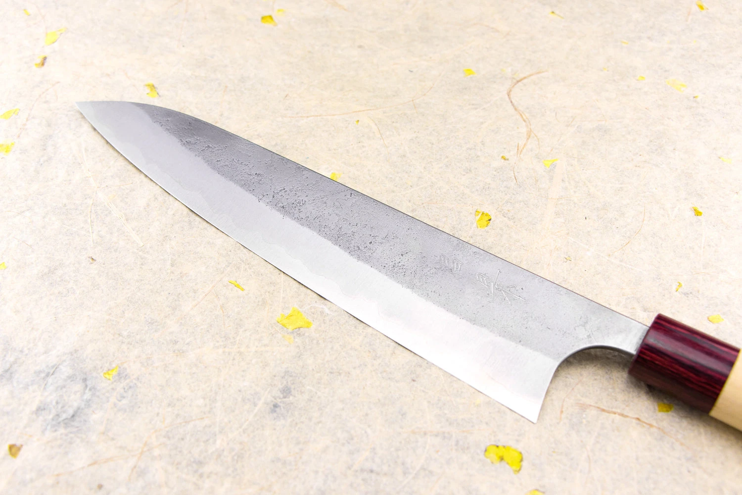 When you pick up the Yuki, you’ll notice just how light it is. The steel is hammered thinner than your average knife, which lets it fly through dense veggies with ease. Shirogami, or ‘white carbon’ in English, is a very traditional steel prized by blacksmiths and knife nerds alike for its great edge retention and legendary sharpness. Yuki knives are clad in softer stainless steel, so only the very edge has to be kept dry to prevent rust. This line is one of our most popular and a frequent gateway into the world of hand-hammered knives.