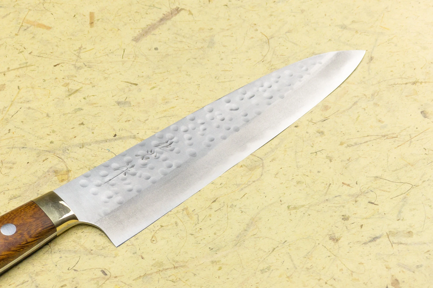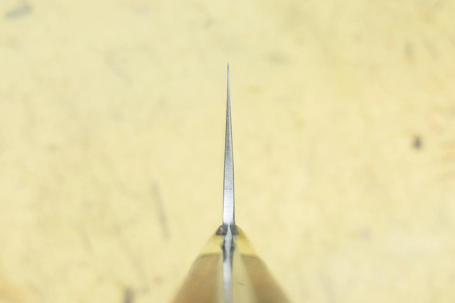 About the Shape – Inspired by the profile of a traditional European chef knife, gyutos are a multi purpose knife with a slight meat cutting bias and “gyuto” even translates to “cow sword”. If you want one knife to do it all, This is it. The longer blade typically gives the blade a forward balance that allows it to work for you. While the blade would ideally by slid forward or back while cutting, they are also great for folks that prefer to ‘rock’ their knife while cutting.