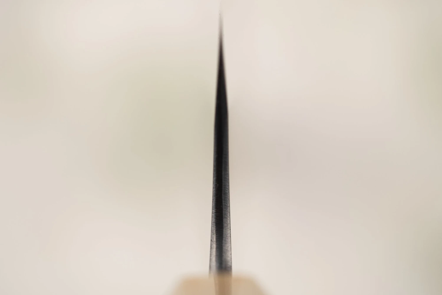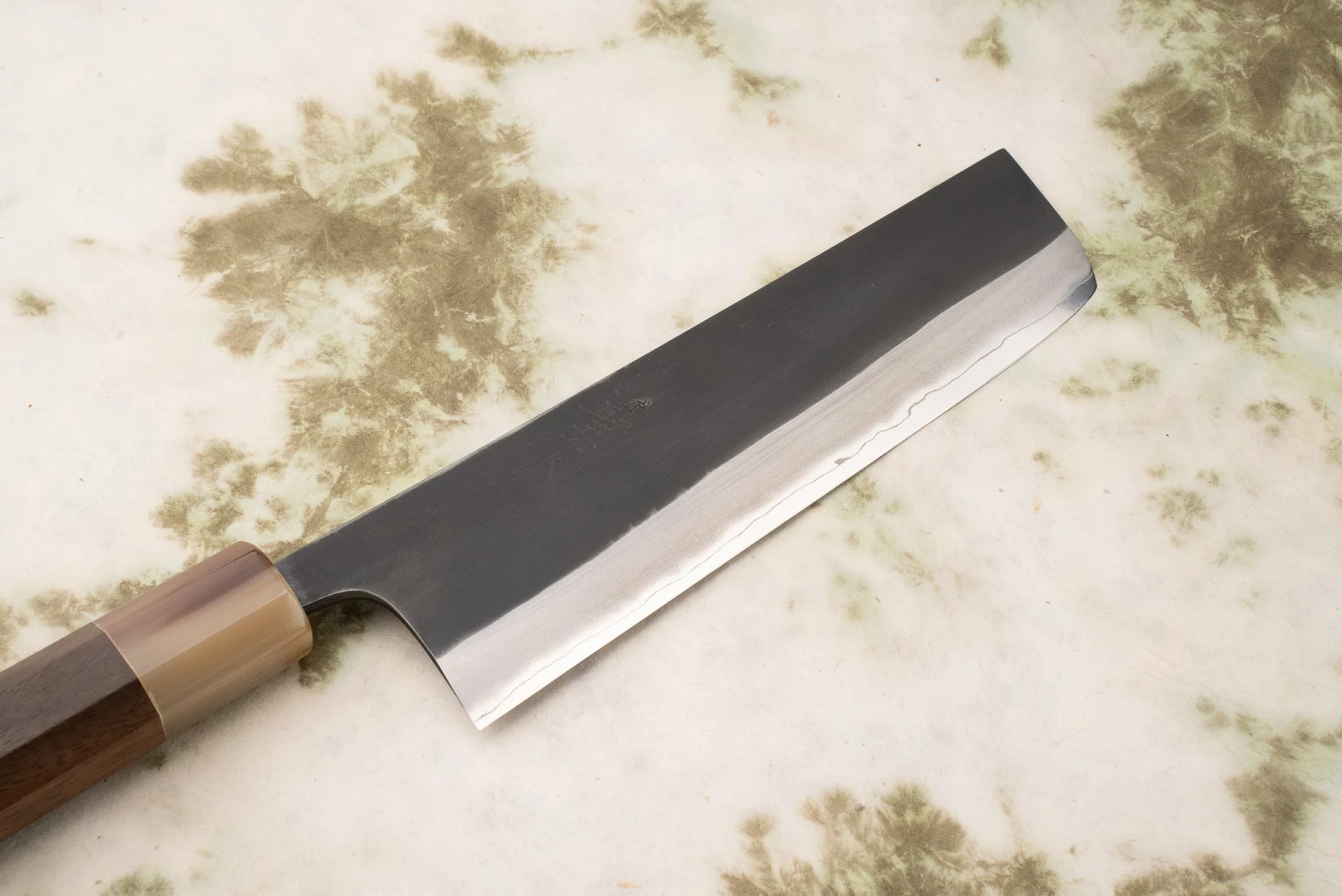 This blade’s core is made from hard SLD steel clad in softer stainless steel, which Masashi-san can push to the absolute limit of hardness through his impressive skill and a couple of top-secret techniques. In plain English, this means they keep a crazy sharp edge for a long time but are much lower maintenance than traditional carbon steel blades. He sharpens blades in a unique way, making the back end more robust for chopping and the tip more precise for delicate work.