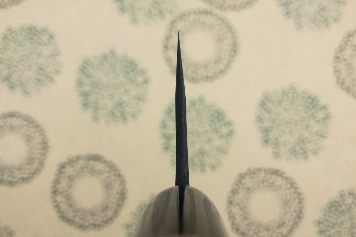 This blade’s core is made from hard SLD steel clad in softer stainless steel, and, thanks to his insane skill and blacksmithing genius, Masashi-san has pushed it to the absolute limit of hardness. Basically, this means his knives stay sharp way longer than this steel typically would but aren’t as fragile as most steel in this category. The best of both worlds!