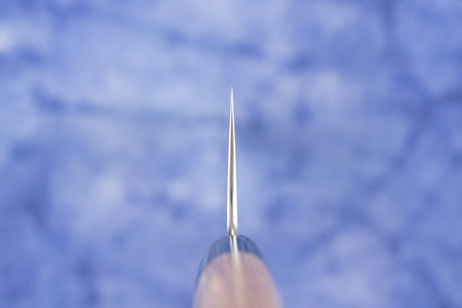 Masashi-san made this knife from a phenomenal steel called SLD, which he can push to the absolute limits of hardness due entirely to his knifemaking genius and a few top-secret techniques. He sharpens this knife with his unique trademark edge, making the back end a little tougher for chopping and the tip finer for delicate work.