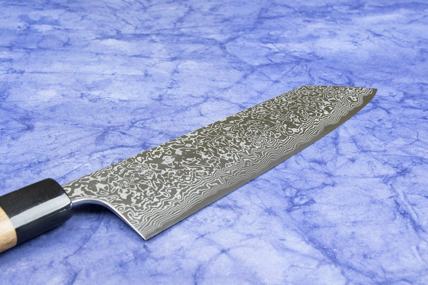 Masashi-san made this knife from a phenomenal steel called SLD, which he can push to the absolute limits of hardness due entirely to his knifemaking genius and a few top-secret techniques. He sharpens this knife with his unique trademark edge, making the back end a little tougher for chopping and the tip finer for delicate work.