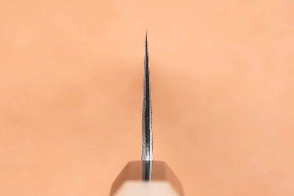 About Masashi Kaijin – The blade’s core is made from hard VS1 steel clad in softer stainless steel. Through a special heat-treating process, Masashi-san can make VS1 incredibly hard, giving it edge retention on par with high-end carbon steel. He sharpens blades in a unique way, making the back end more robust for chopping and the tip more precise for delicate work.
