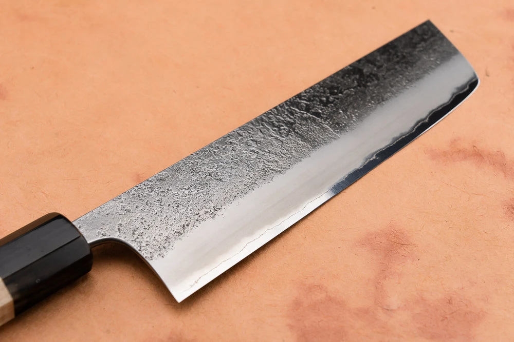 The blade’s core is made from hard VS1 steel clad in softer stainless steel. Through a special heat-treating process, Masashi-san can make VS1 incredibly hard, giving it edge retention on par with high-end carbon steel. He sharpens blades in a unique way, making the back end more robust for chopping and the tip more precise for delicate work.