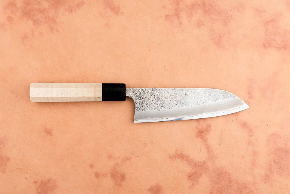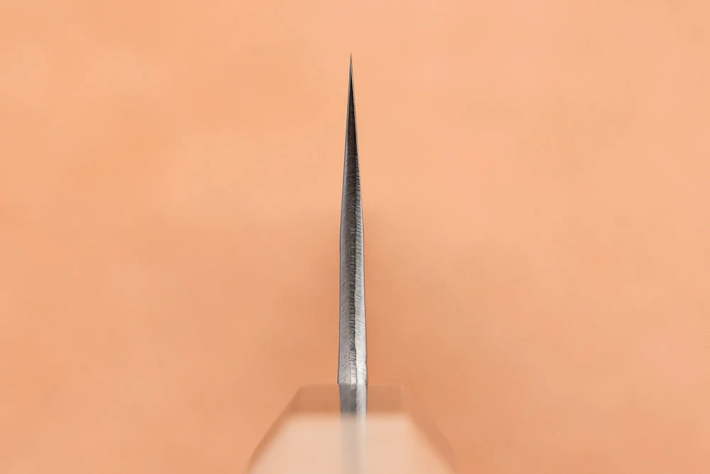 The blade’s core is made from hard VS1 steel clad in softer stainless steel. Through a special heat-treating process, Masashi-san can make VS1 incredibly hard, giving it edge retention on par with high-end carbon steel. He sharpens blades in a unique way, making the back end more robust for chopping and the tip more precise for delicate work.