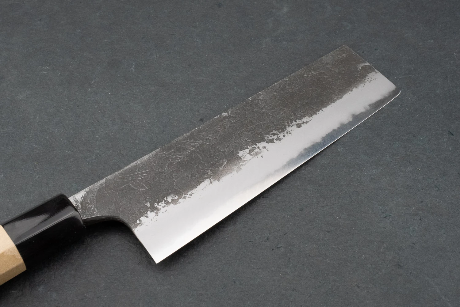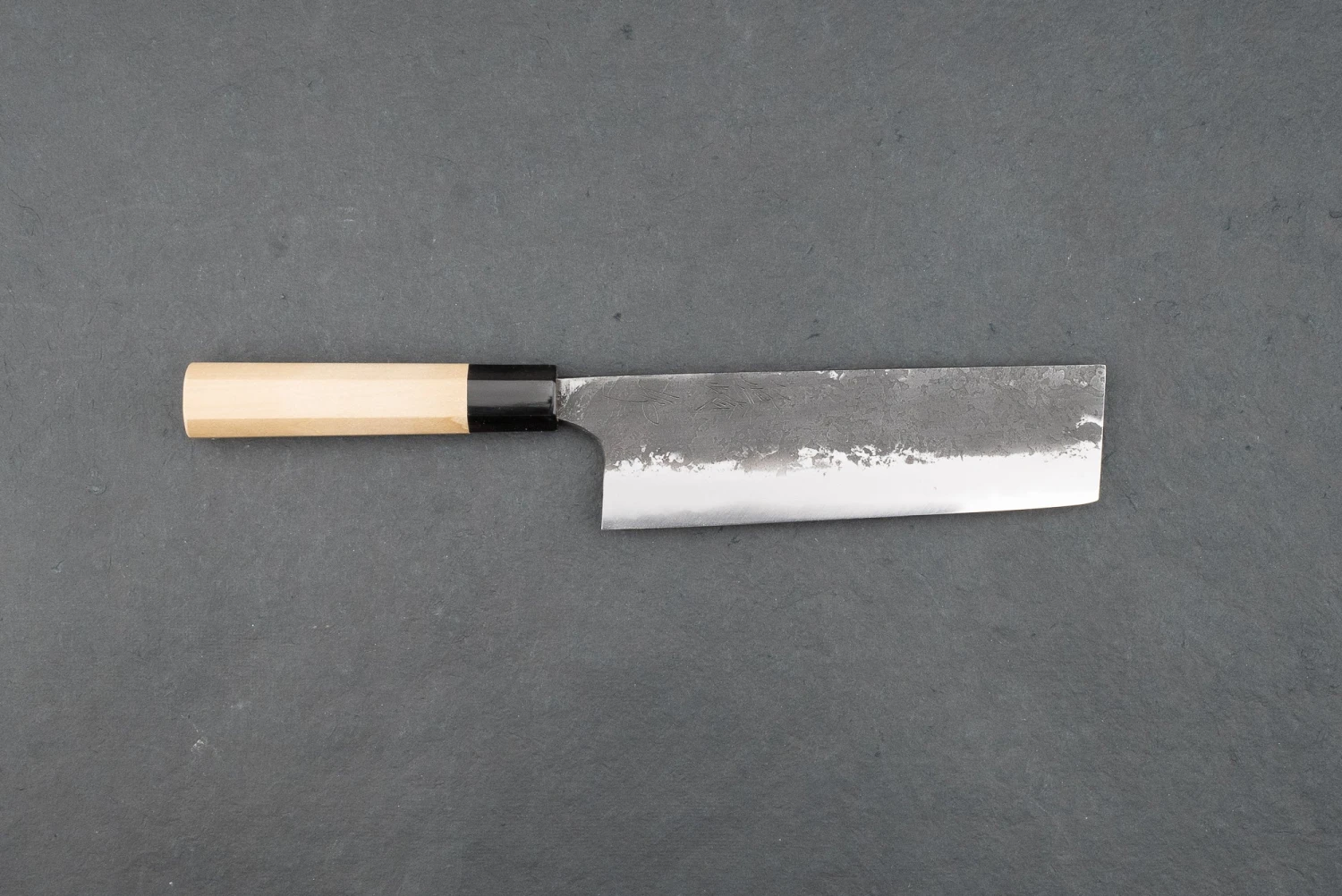 Mazaki san prefers to work with the more traditional Shirogami #2 to craft his knives and often leaves the rough, burned ‘kurouchi’ finish from the forge. Not just used for tradition’s sake, Shirogami is capable of insane sharpness and edge retention. It’s easily one of my favourite knife steels; it cuts beautifully, but it also changes with time, building a patina totally unique to you and the food you cook.