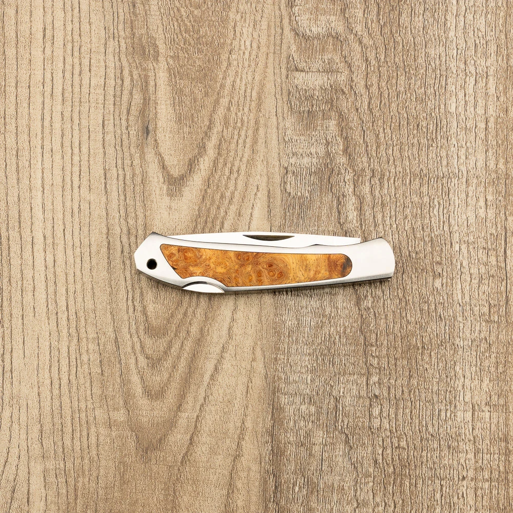 The Moki Kitakitsune, which translates to Red Fox has a polished solid SUS410 stainless steel handle with Quince wood inlay and an AUS8 Stainless Steel blade. It also comes with a leather belt pouch for easy storage.