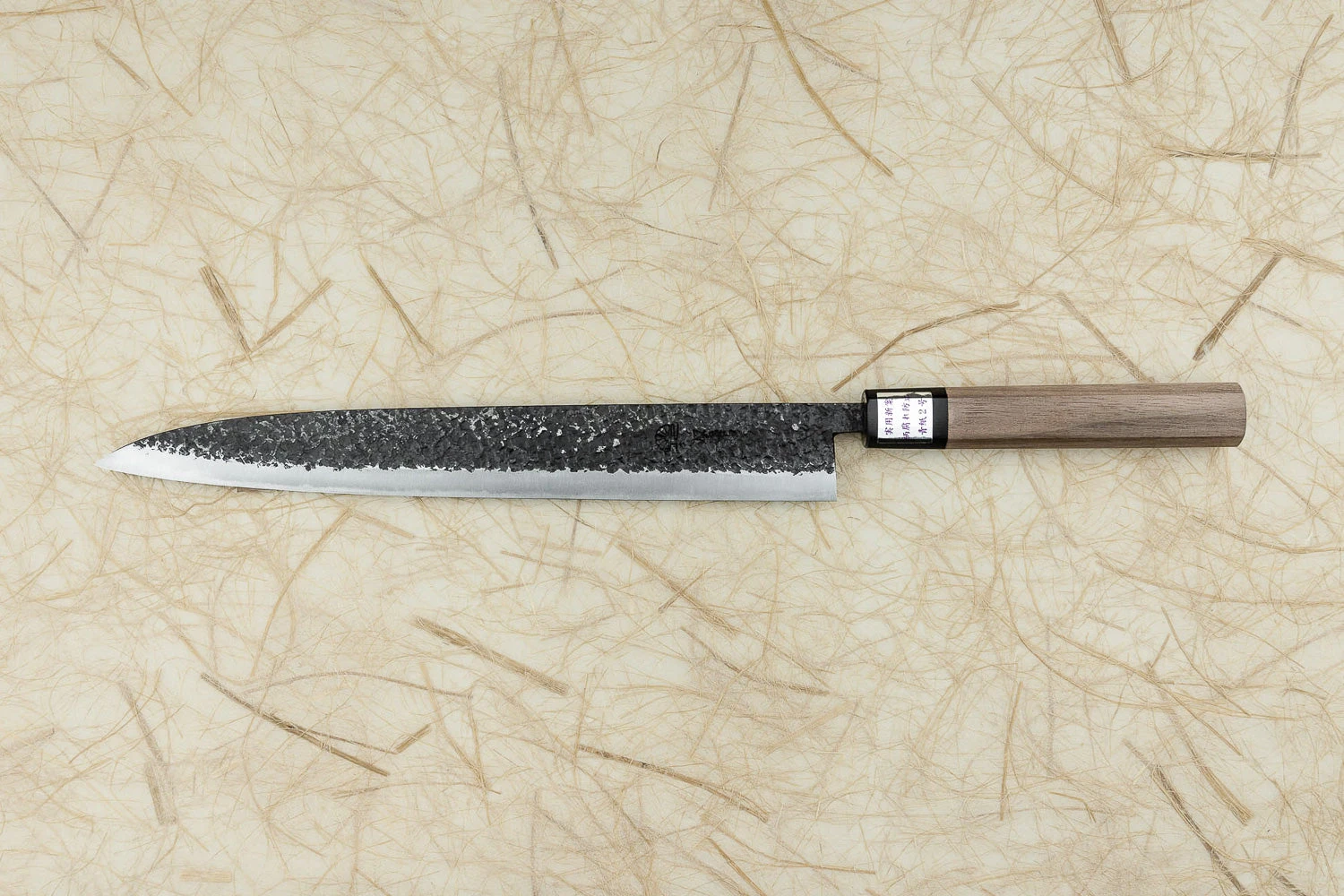 About the Shape – “Sujihiki” translates to “Flesh Slicer” and it does exactly what the name suggests, perfect for carving and slicing roasts, turkey, raw meats, fish, and all other proteins and the extended blade length allows you to slice with one long stroke, instead of sliding the knife back and forth in a sawing motion. Making clean slices of brisket or ultra-thin applications like Carpaccio a breeze to execute.