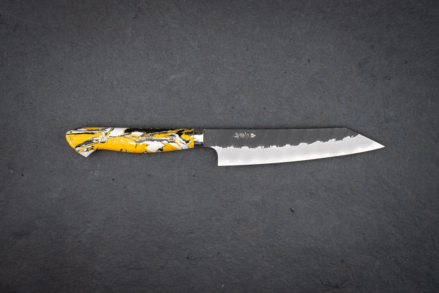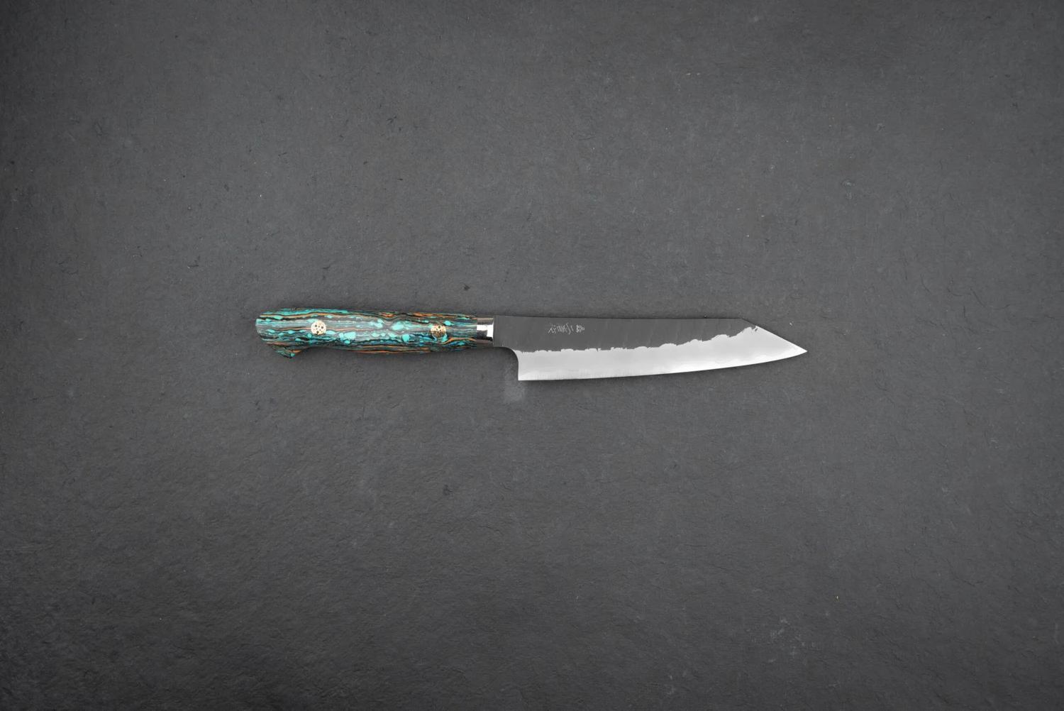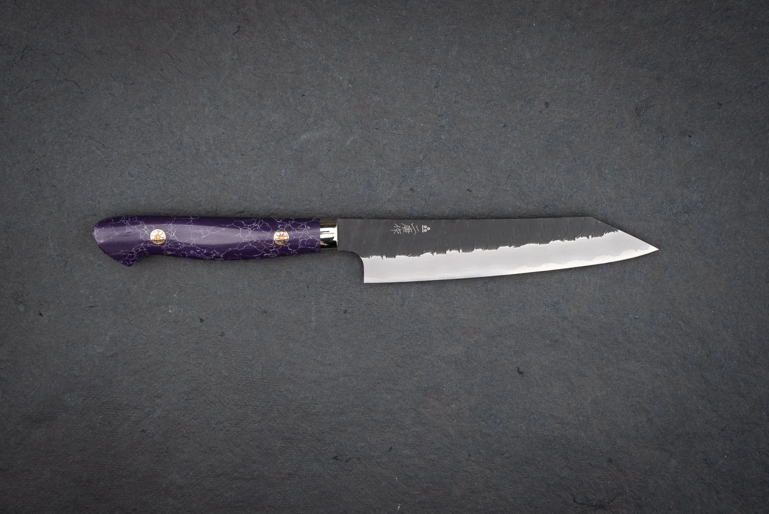 About Nigara Hamono –Nigara-san is a relatively new knifemaker out of Aomori prefecture, but they are not new as a company. The company has been around for over 350 years, tracing back to their swordsmith ancestors. Knifemaking is a small part of what they do; they also produce large steel beams and such for buildings! Go Yoshizawa, age 35, is a young blacksmith who is the company president’s son and has decided to go back to their blacksmithing roots. He now makes unique and stunning tsuchime knives and some hand-folded Damascus.