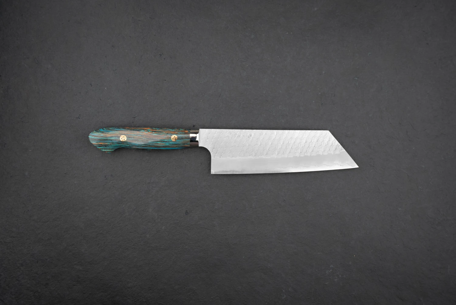 About the Shape – A Nakiri is a vegetable knife. Under utilized in the Western kitchen, the Nakiri’s flat blade is meant for the push/pull chopping of vegetables. Since the entire flat edge of the knife kisses the cutting board at once, you wont be turning the vegetable into an accordion. Accordion vegetables are still connected like a paper doll after you’re “done” cutting them. To truly understand the awesomeness of a Nakiri we recommend making onion soup your first night with the knife. The ease of chopping will blow you away.