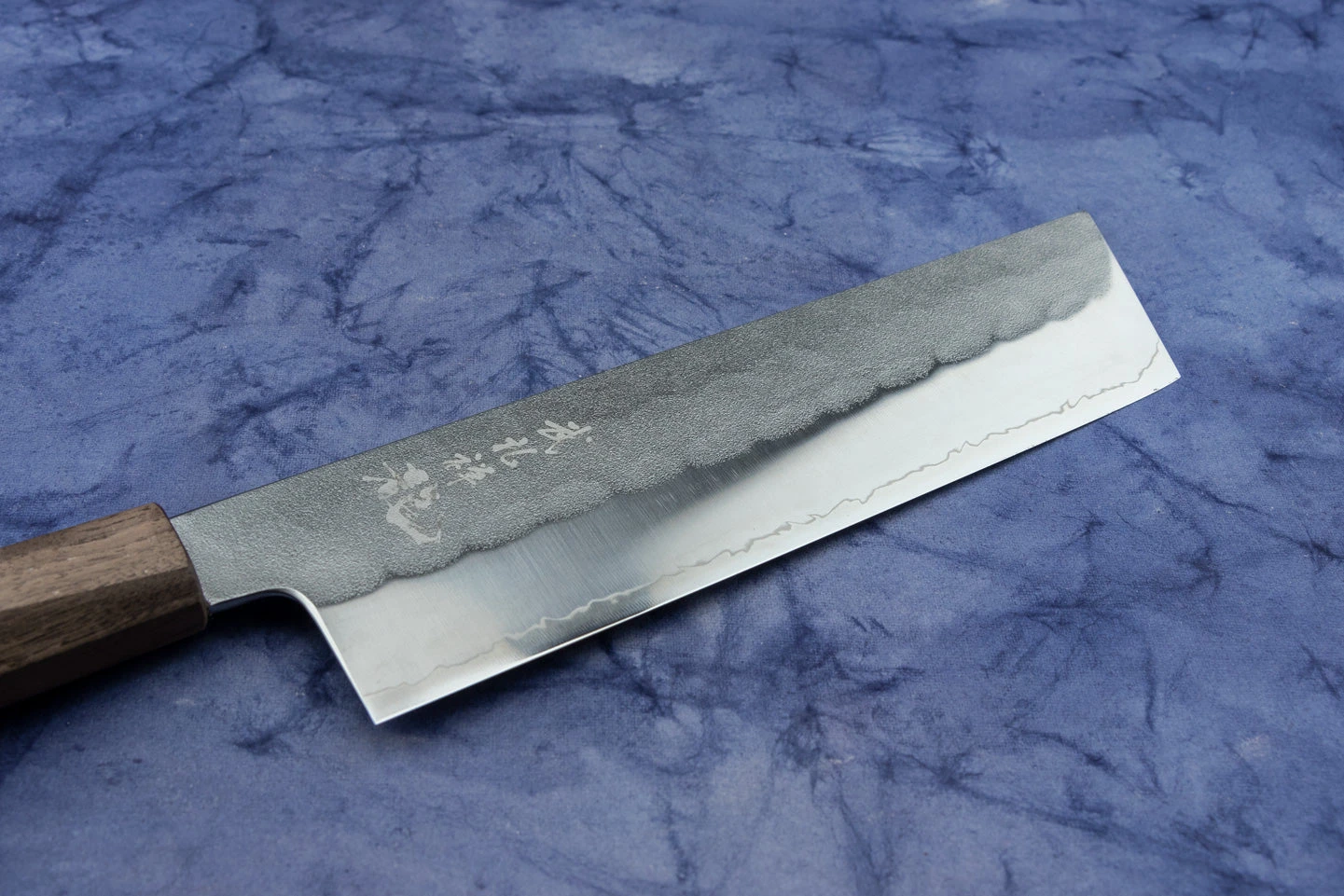 About the Shape – A Nakiri is a vegetable knife. Under utilized in the Western kitchen, the Nakiri’s flat blade is meant for the push/pull chopping of vegetables. Since the entire flat edge of the knife kisses the cutting board at once, you wont be turning the vegetable into an accordion. Accordion vegetables are still connected like a paper doll after you’re “done” cutting them. To truly understand the awesomeness of a Nakiri we recommend making onion soup your first night with the knife. The ease of chopping will blow you away.