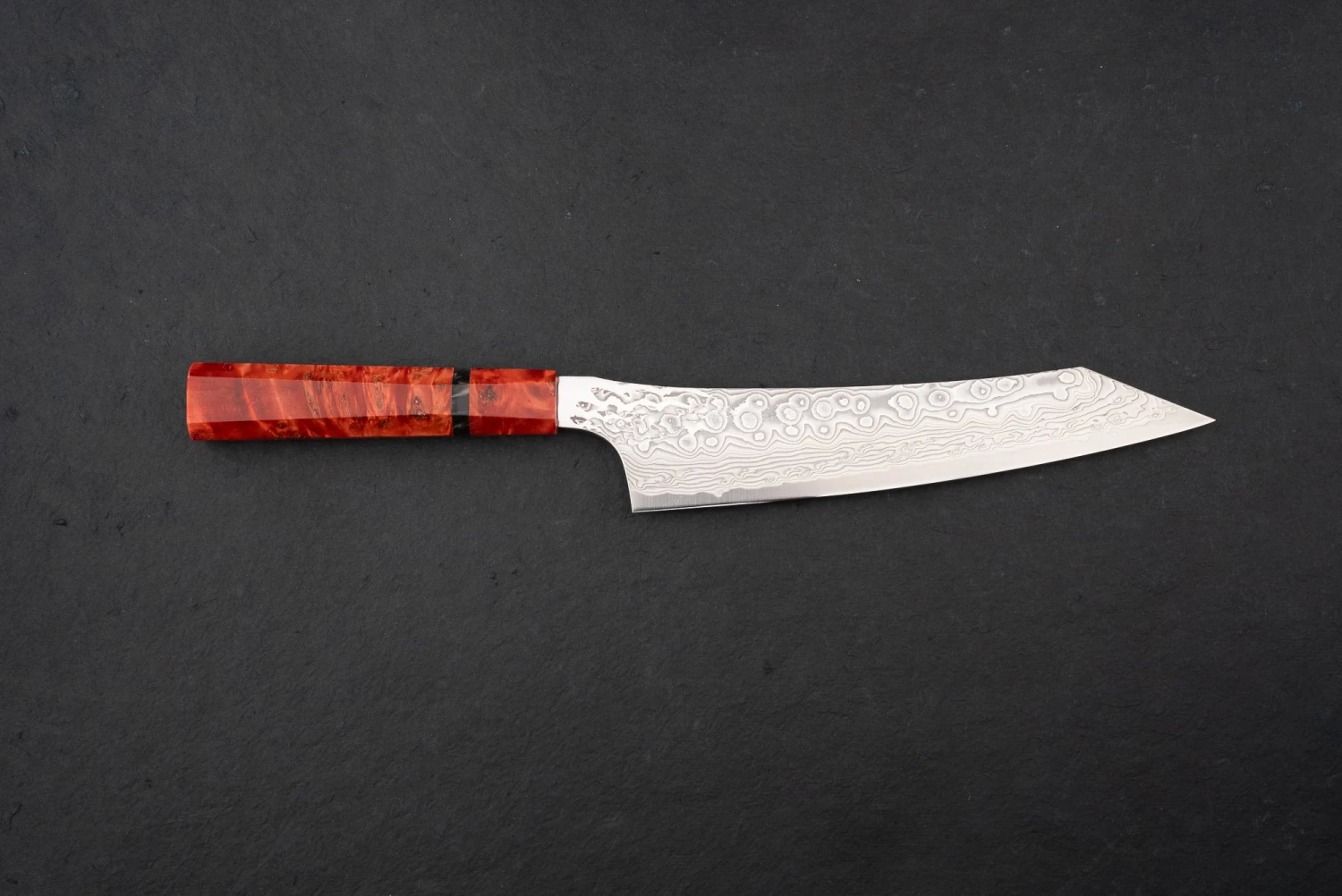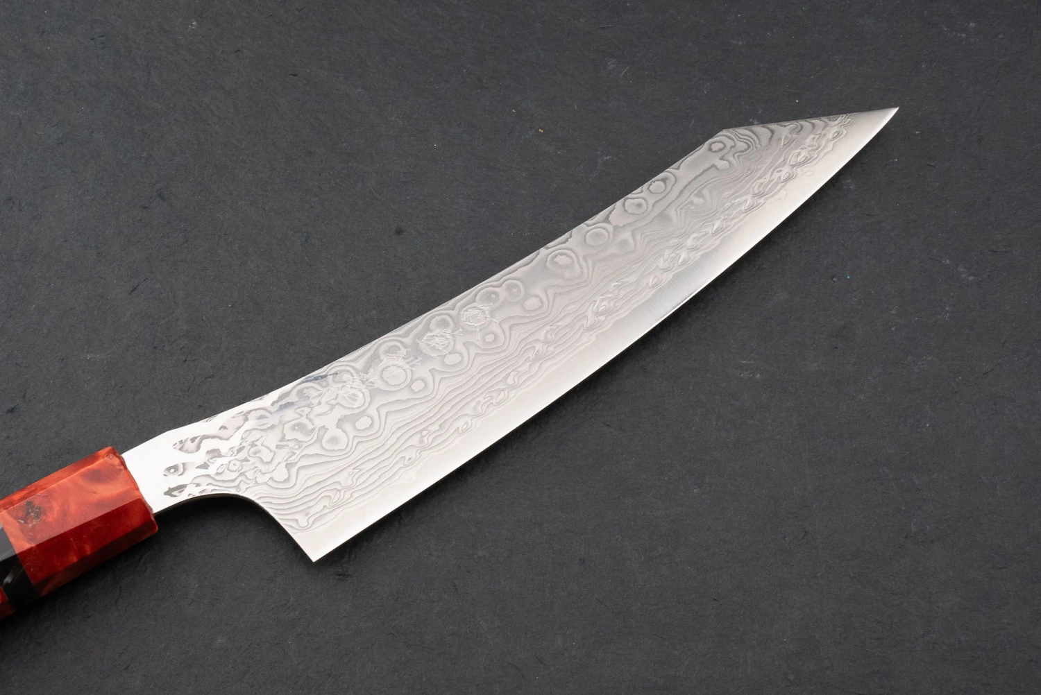The Gurenhiryu (Crimson Dragon) series is the pinnacle of high-end Japanese knife design. The blade is forged from super-hard SPG STRIX stainless steel, known for superior edge-retention and laser-sharpness. The stabilized red poplar handle is the crown jewel on the 63-layer damascus masterpiece.