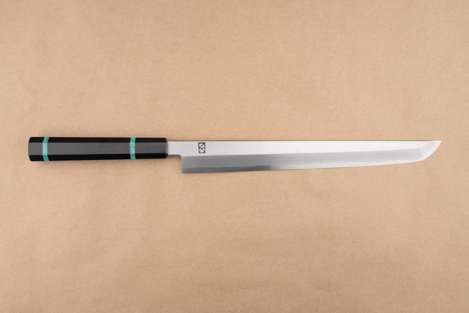 About Sakai Kikumori Ren – Like many knife-producing regions, Sakai is facing a challenge of getting new people to work in the industry. Ren was born and created under the principle of paying young makers a larger share of the profits to help cover the cost of training new staff. They are forged by Nakagawa-san using blue #1 steel, and they have beautiful handles with turquoise accents.