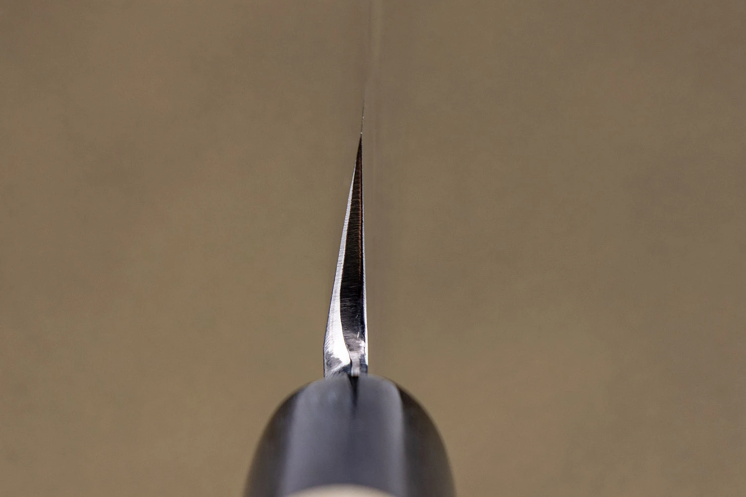 Shirogami (white) carbon is pretty darn great. It’s super easy to sharpen, takes a brilliantly sharp edge, cuts like silk and is very rugged for its hardness. The hard white carbon steel is forge-welded to a piece of softer carbon steel.